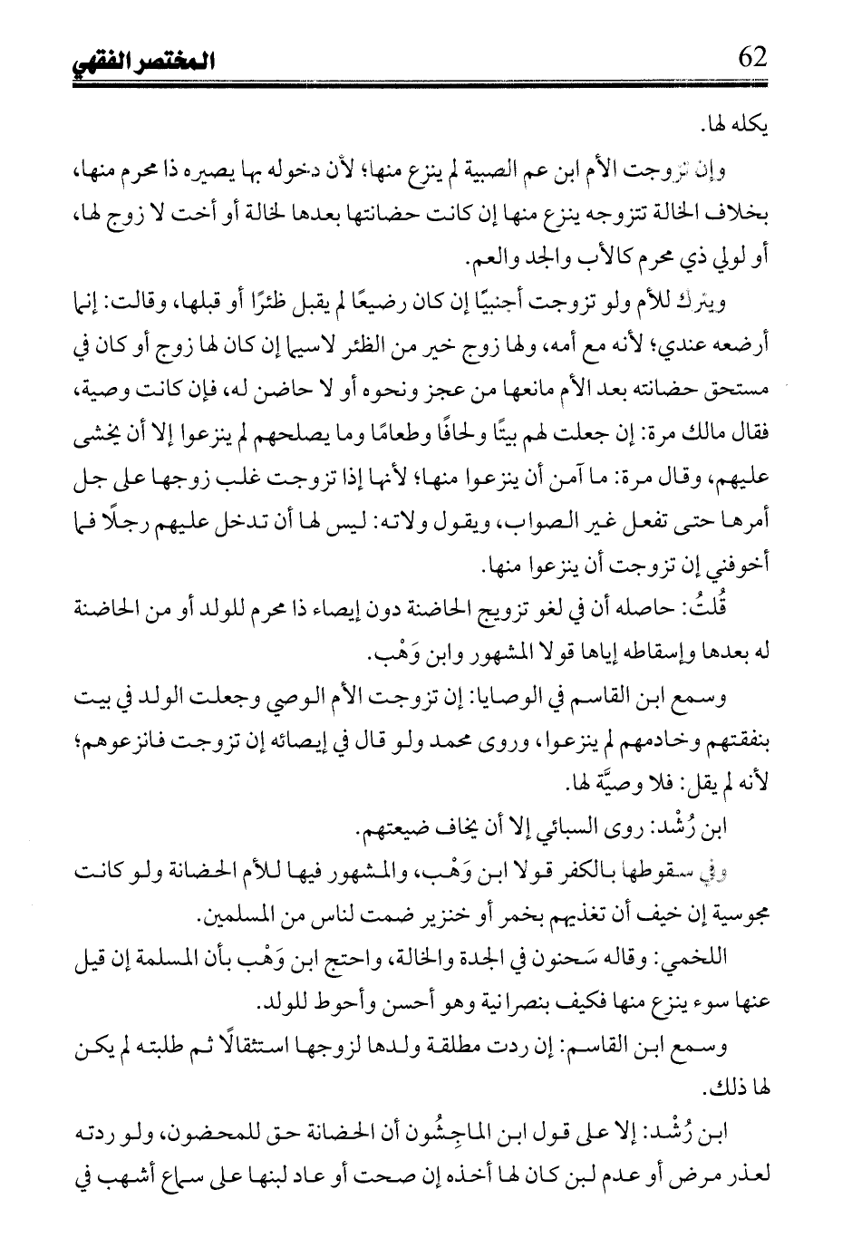 وفي سقوطها بالكفر قولا ابن وَهب، والمشهور فيها للأم الحضانة ولو كانت مجوسية إن خيف أن تعذيبهم بخمر أو خنزير ضمت لناس من المسلمين.