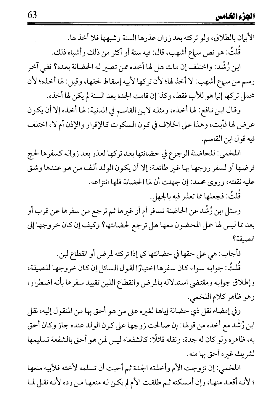 وسئل ابن رُشْد عن الحاضنة تسافر أم أو غيرها ثم ترجع من سفرها عن قريب أو بعد مما ليس لها حمل المحضون معها هل ترجع لحضانتها؟ وكيف إن كان خروجها إلى الصيفة؟
