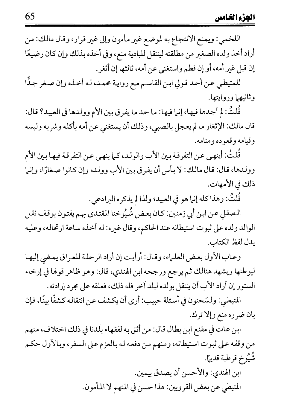 قُلتُ: لم أجدها فيها، إنما فيها: ما حد ما يفرق بين الأم وولدها في العبيد؟ قال: قال مالك: الإثغار ما لم يعجل بالصبي، وذلك أن يستغني عن أمه بأكله وشربه ولبسه وقيامه وقعوده ومنامه.