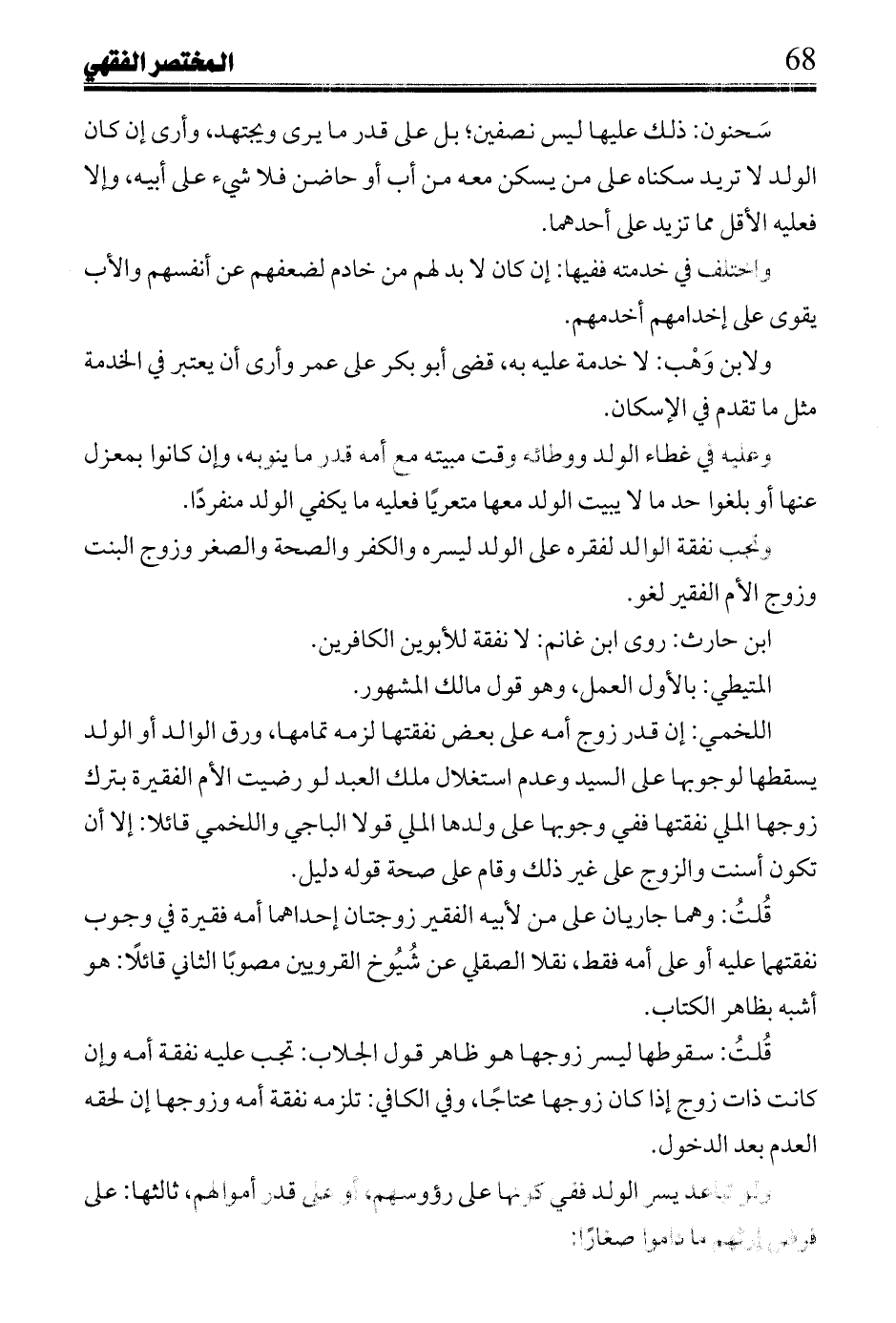 قُلتُ: وهما جاريان على من لأبيه الفقير زوجتان إحداهما أمه فقيرة في وجوب نفقتهما عليه أو على أمه فقط، نقلا الصقلي عن شُيُوخ القرويين مصوبًا الثاني قائلًا: هو أشبه بظاهر الكتاب.