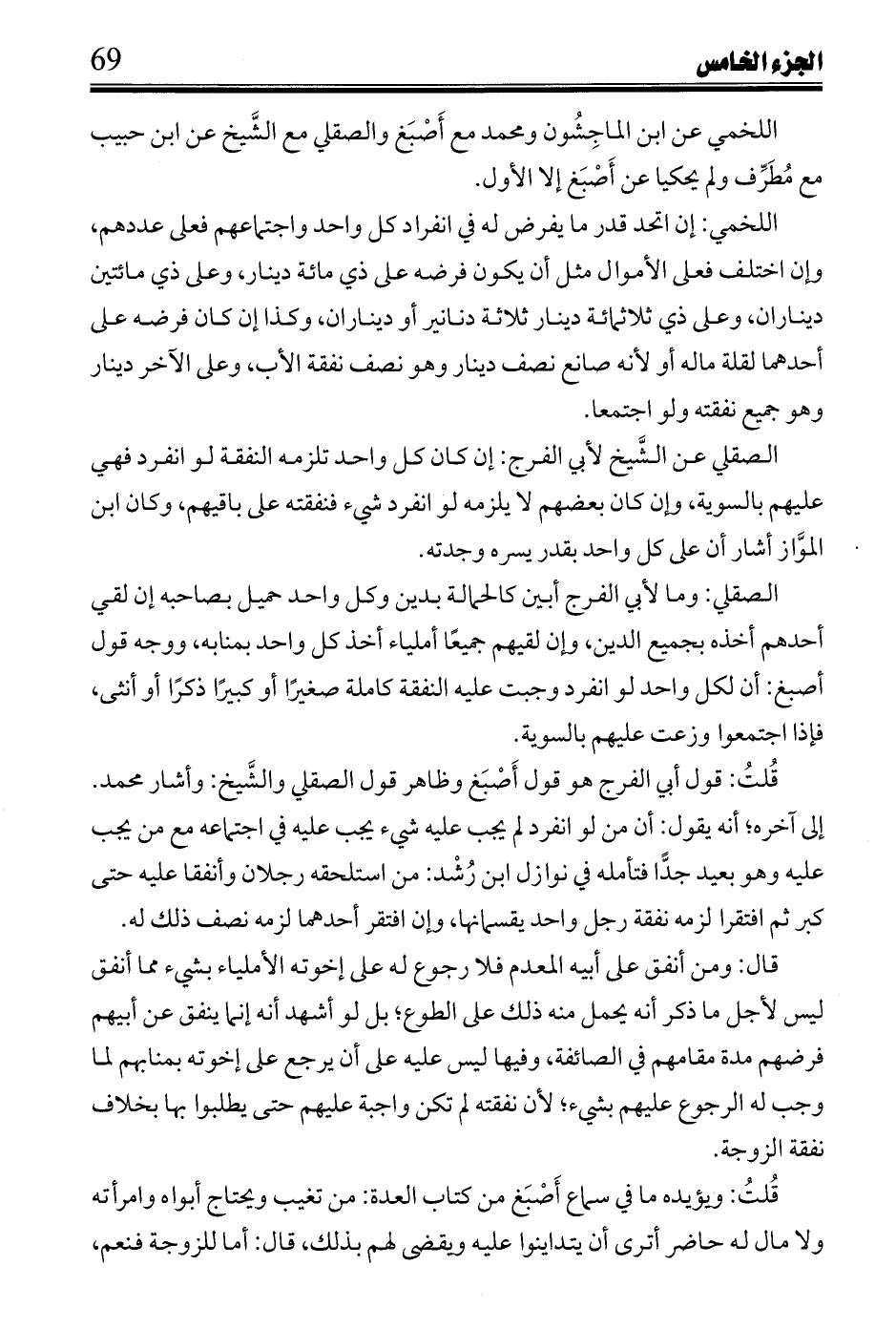 الصقلي: وما لأبي الفرج أبين كالحمالة بدين وكل واحد حميل بصاحبه إن لقي أحدهم أخذه بجميع الدين، وإن لقيهم جميعًا أملياء أخذ كل واحد بمنابه، ووجه قول أصبغ: أن لكل واحد لو انفرد وجبت عليه النفقة كاملة صغيرًا أو كبيرًا أو أنثى، فإذا اجتمعوا وزعت عليهم بالسوية.