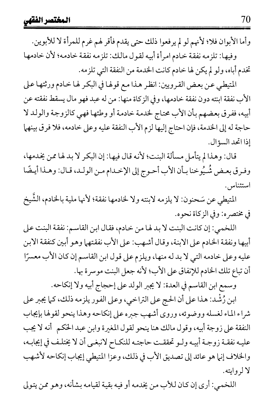 المتيطي عن سَحنون: لا يلزمه لابنته ولا لخادمها نفقة؛ لأنها ملية بالخادم، الشَّيخ في مختصره: وفي الزكاة نحوه.