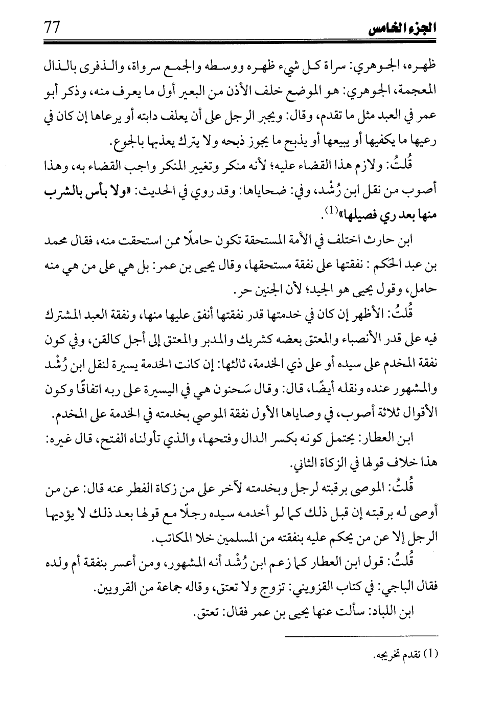 قُلتُ: قول ابن العطار كما زعم ابن رُشْد أنه المشهور، ومن أعسر بنفقة أم ولده فقال الباجي: في كتاب القزويني: تزوج ولا تعتق، وقاله جماعة من القرويين.