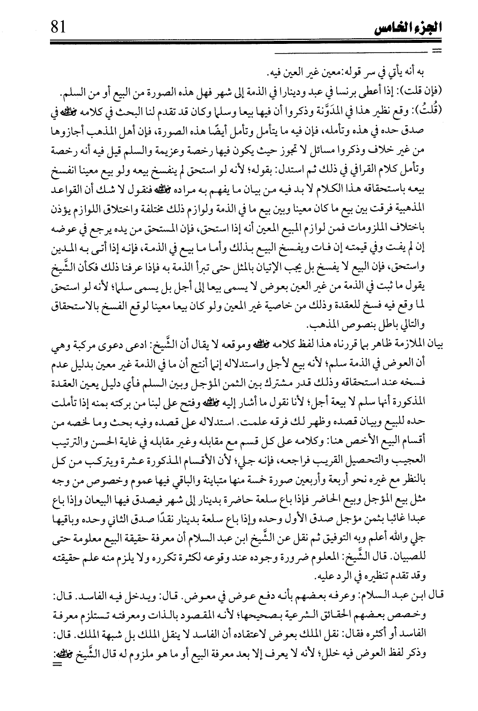 والتعريف الأول لأحد نقلي اللخمي أن البيع: التعاقد والتقابض، والثاني للمازري والصقلي، وقصره التعقب عليهما بما ذكر يرد بأن الأول: لا يتناول إلا بيع المعطاة؛ وبأن الثاني: لا يتناول شيئًا من البيع؛ لأن نقل الملك لازم للبيع أعم منه، وكونه بعوض يخصصه بالبيع عن ملك الهبة، والصدقة ولا يصره نفس البيع، ويدخل فيه النكاح والإجارة، وفي كتاب الغرر منها من قال لك: «أبيعك سكنى داري سنة»، فذلك غلط في اللفظ، وهو كراء صحيح، وقوله: «العوض أخص من البيع» يرد بأنه أعم منه، لثبوته في النكاح، وغيره تقدم لابن بشير: «النكاح عقد على العضو بعوض».