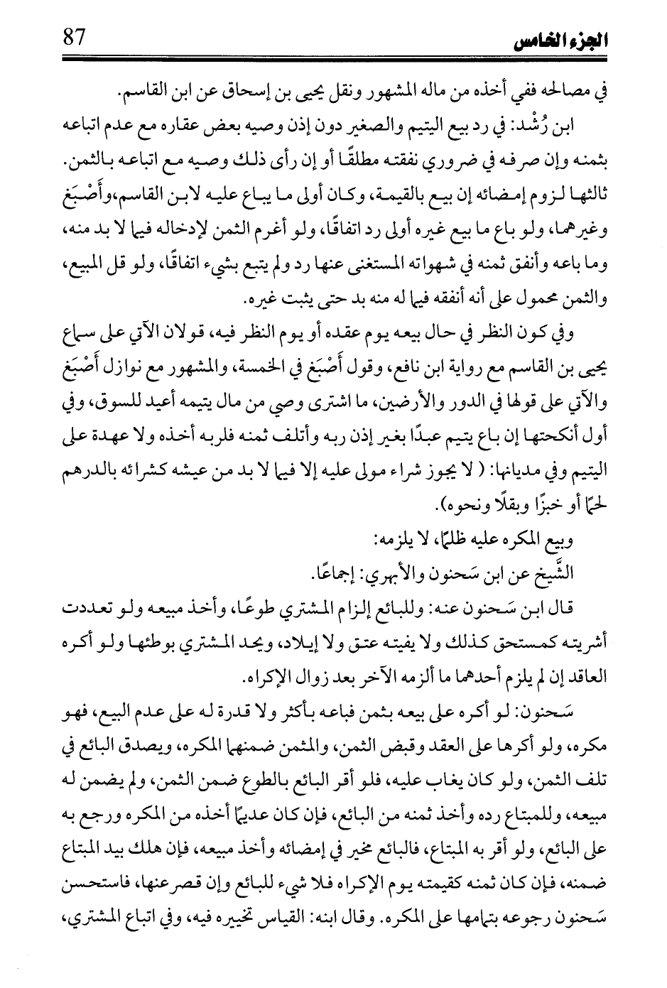 الشيخ عن مطرف، وابن عبد الحَكم وأصبغ: والعامل يعزله الوالي على سخطه، أو يتقبل الكورة بمال يلتزمه، ويأخذ أهلها بما شاء من الظلم، فيعجز، أو يتقبل المعدن فيعجز عما عليه فيه فيغرمه الوالي مالًا بعذاب حتى يلجئه لبيع ماله، فبيعه ماض عليه كمضغوط في حق عليه سواء أخذ الوالي ما له لنفسه أو رده على أربابه كمكره أو مضغوط في بيع لحق عليه أو دين لازم، وكذا بيع أهل الذمة أو العنوة فيما عليهم من جزيٍة وأهل الصلح فيما صالحوا عليه.