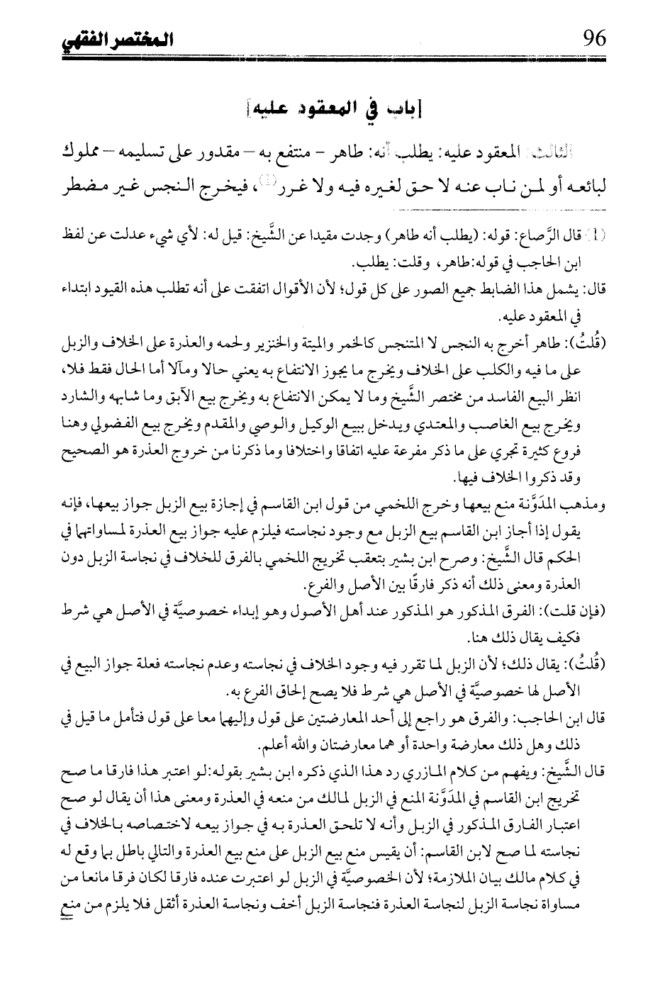 ابن رُشْد: في جواز بيعه والاتفاق به، ثالثها ينتفع به ولا يباع لابن وَهْب مع قيامه من سماع ابن القاسم في صابون طبخ بزيت، وقعت فيه فأرة، ومعلوم مذهب ابن القاسم مع روايته وقول ابن الماجِشُون، ورواية ابن القاسم في جامع العتبية: ترك الانتفاع به أحب إليَّ.