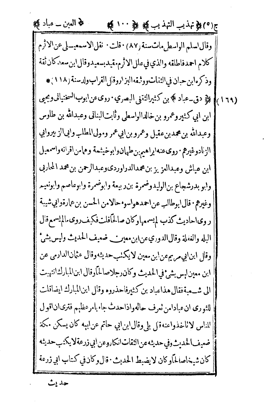 169 - "د ق – عباد" بن كثير الثقفي البصري روى عن أيوب السختياني ويحيى بن أبي كثير وعمرو بن خالد الواسطي وثابت البناني وعبد الله بن طاوس وعبد الله بن محمد بن عقيل وعمرو بن أبي عمرو مولى المطلب وأبي الزبير وأبي الزناد وغيرهم روى عنه إبراهيم بن طهمان وأبو خيثمة وهما من أقرانه وإسماعيل بن عياش وعبد العزيز بن محمد الدراوردي وعبد الرحمن بن محمد المحاربي وأبو بدر شجاع بن الوليد وضمرة بن ربيعة وأبو ضمرة وأبو عاصم وأبو نعيم وغيرهم قال أبو طالب عن أحمد هو أسوأ حالا من الحسن بن عمارة وأبي شيبة روى أحاديث كذب لم يسمعها وكان صالحا قلت فكيف روى ما لم يسمع قال البله والغفلة وقال الدوري عن ابن معين ضعيف الحديث وليس بشيء وقال ابن أبي مريم عن ابن معين لا يكتب حديثه وقال عثمان الدارمي عن ابن معين ليس بشيء في الحديث وكان رجلا صالحا وقال ابن المبارك انتهيت إلى شعبة فقال هذا عباد بن كثير فأحذروه وقال ابن المبارك أيضا قلت للثوري إن عبادا من تعرف حاله وإذا حدث جاء بأمر عظيم فترى أن أقول للناس لا تأخذوا عنه قال بلى وقال ابن أبي حاتم عن أبيه كان يسكن مكة ضعيف الحديث وفي حديثه عن الثقات إنكار وعن أبي زرعة لا يكتب حديثه كان شيخا صالحا وكان لا يضبط الحديث قال وكان في كتاب أبي زرعة