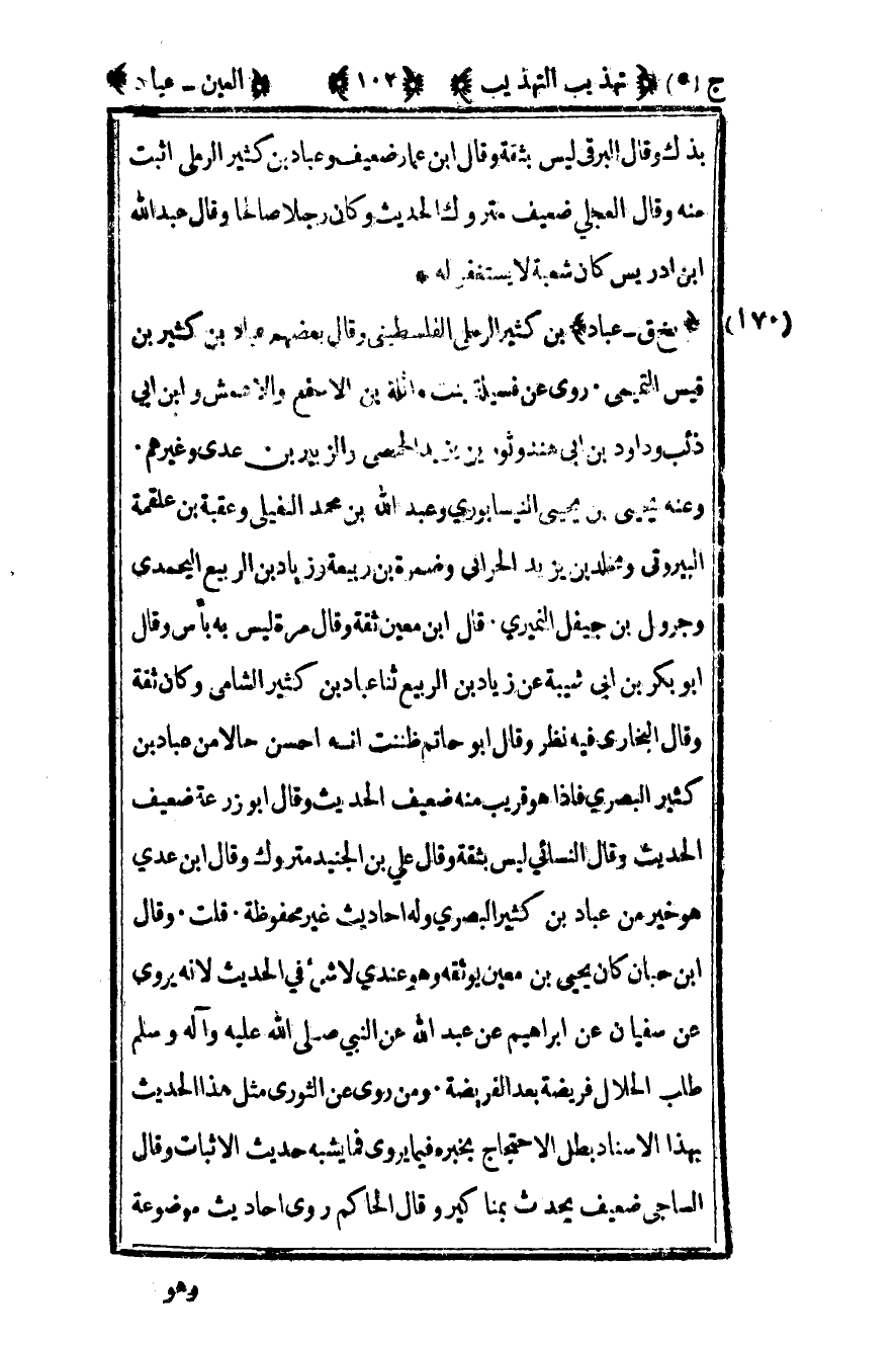 170 - "بخ ق عباد" بن كثير الرملي الفلسطيني وقال بعضهم عباد بن كثير بن قيس التيمي روى عن فسيلة بنت واثلة بن الأسقع والأعمش وابن أبي ذئب وداود بن أبي هند وثور بن يزيد الحمصي والزبير بن عدي وغيرهم وعنه يحيى بن يحيى النيسابوري وعبد الله بن محمد النفيلي وعقبة بن علقمة البيروتي ومخلد بن يزيد الحرابي وضمرة بن ربيعة وزياد بن الربيع اليحمدي وجرول بن جيفل النميري قال ابن معين ثقة وقال مرة ليس به بأس وقال أبو بكر بن أبي شيبة عن زياد بن الربيع ثنا عباد بن كثير الشامي وكان ثقة وقال البخاري فيه نظر وقال أبو حاتم ظننت أنه أحسن حالا من عباد بن كثير البصري فإذا هو قريب منه ضعيف الحديث وقال أبو زرعة ضعيف الحديث وقال النسائي ليس بثقة وقال علي بن الجنيد متروك وقال ابن عدي هو خير من عباد بن كثير البصري وله أحاديث غير محفوظة قلت وقال ابن حبان كان يحيى بن معين يوثقه وهو عندي لا شيء في الحديث لأنه يروي عن سفيان عن إبراهيم عن عبد الله عن النبي صلى الله عليه وسلم طلب الحلال فريضة بعد الفريضة ومن روى عن الثوري مثل هذا الحديث بهذا الإسناد بطل الاحتجاج بخبره فيما يروي فما يشبه حديث الاثبات وقال الساجي ضعيف يحدث بمناكير وقال الحاكم روى أحاديث موضوعة