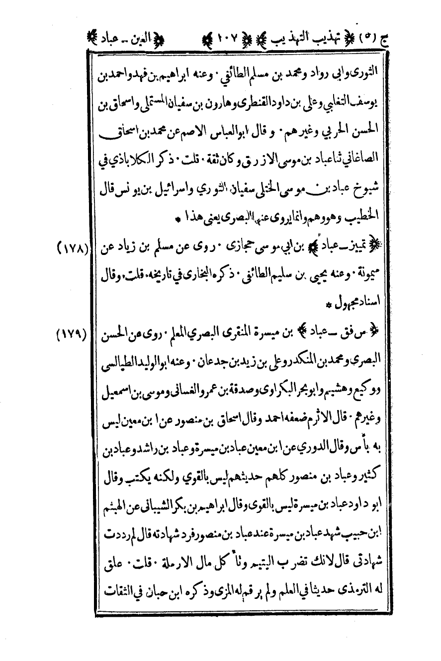 178 - "تمييز – عباد" بن أبي موسى حجازي روى عن مسلم بن زياد عن ميمونة وعنه يحيى بن سليم الطائفي ذكره البخاري في تاريخه قلت وقال إسناد مجهول.