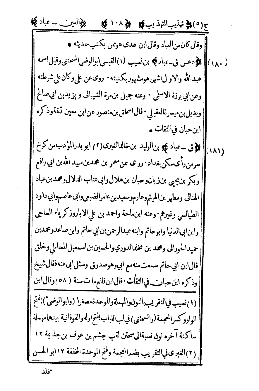 181 - "ق – عباد" بن الوليد بن خالد الغبري2 أبو بدر المؤدب من كرخ سر من رأى سكن بغداد روى عن معمر بن محمد بن عبيد الله بن أبي رافع وبكر بن يحيى بن زبان وحبان بن هلال وأبي عتاب الدلال ومحمد بن عباد الهنائي ومطهر بن الهيثم وعارم وسعيد بن عامر الضبعي وأبي عاصم وأبي داود الطيالسي وغيرهم وعنه بن ماجة وأحمد بن علي الأبار وزكرياء الساجي وابن أبي الدنيا وأبو حاتم وابنه عبد الرحمن بن أبي حاتم وابن صاعد ومحمد بن حميد الحوراني ومحمد بن مخلد الدوري والحسين بن إسماعيل المحاملي وخلق قال ابن أبي حاتم سمعت منه مع أبي وهو صدوق وسئل أبي عنه فقال شيخ وذكره ابن حبان في الثقات قال ابن قانع مات سنة 58 وقال ابن