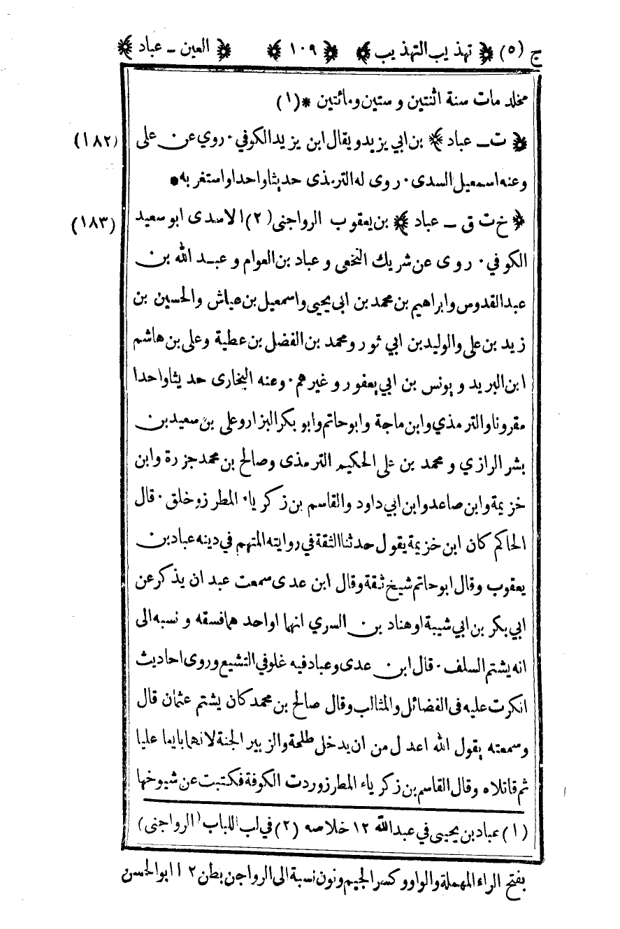 183 - "خ ت ق – عباد" بن يعقوب الرواجني2 الأسدي أبو سعيد الكوفي روى عن شريك النخعي وعباد بن العوام وعبد الله بن عبد القدوس وإبراهيم بن محمد بن أبي يحيى وإسماعيل بن عياش والحسين بن زيد بن علي والوليد بن أبي ثور ومحمد بن الفضل بن عطية وعلي بن هاشم بن البريد ويونس بن أبي يعفور وغيرهم وعنه البخاري حديثا واحدا مقرونا والترمذي وابن ماجة وأبو حاتم وأبو بكر البزار وعلي بن سعيد بن بشر الرازي ومحمد بن الحكيم الترمذي وصالح بن محمد جزرة وابن خزيمة وابن صاعد وابن أبي داود والقاسم بن زكريا المطرز وخلق قال الحاكم كان ابن خزيمة يقول حدثنا الثقة في روايته المتهم في دينه عباد بن يعقوب وقال أبو حاتم شيخ ثقة وقال ابن عدي سمعت عبدان يذكر عن أبي بكر بن أبي شيبة أو هناد بن السري أنهما أو أحدهما فسقه ونسبه إلى أنه يشتم السلف قال ابن عدي وعباد فيه غلو في التشيع وروى أحاديث أنكرت عليه في الفضائل والمثالب وقال صالح بن محمد كان يشتم عثمان قال وسمعته يقول الله أعدل من أن يدخل طلحة والزبير الجنة لأنهما بايعا عليا ثم قاتلاه وقال القاسم بن زكريا المطرز وردت الكوفي فكتبت عن شيوخها