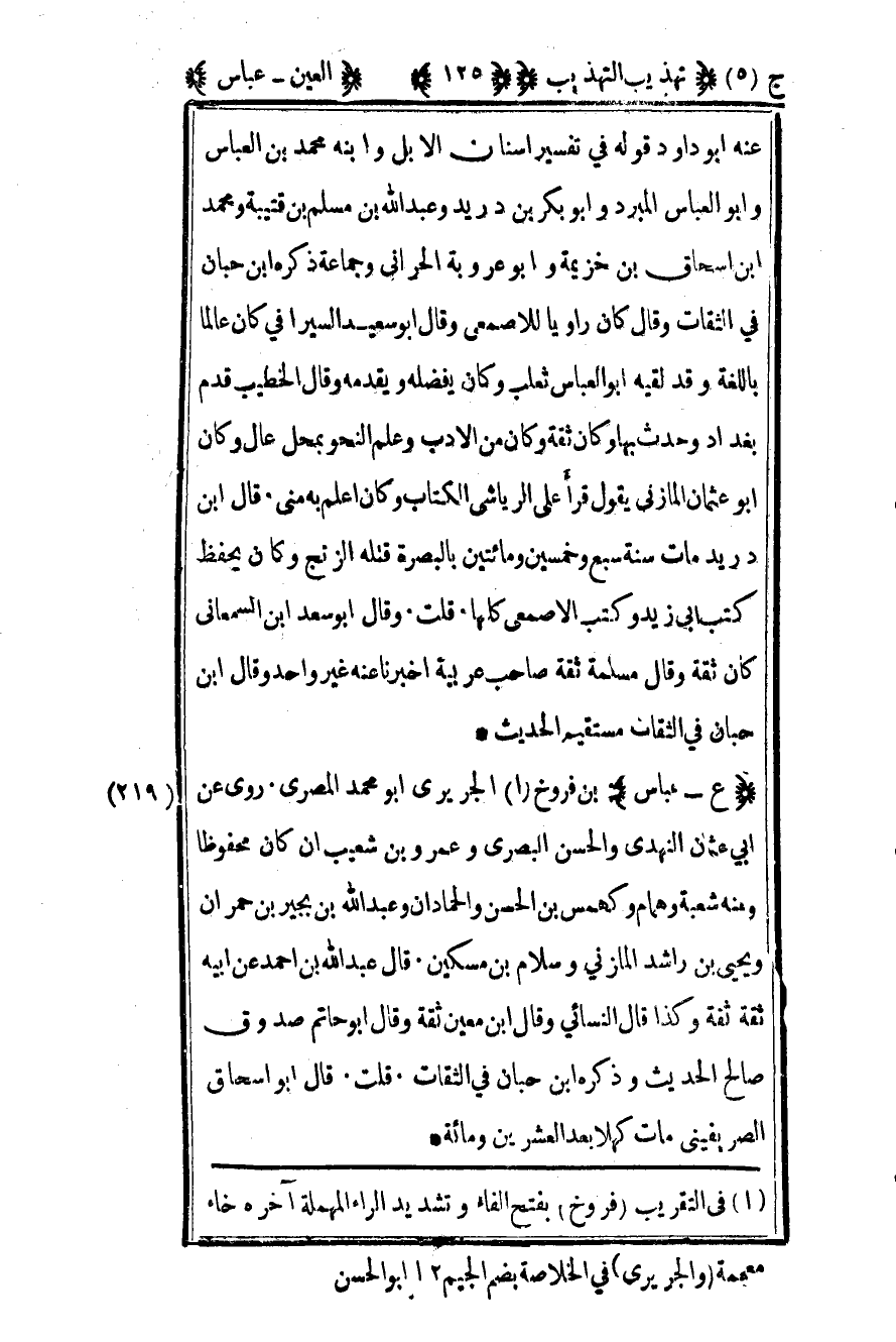 219 - "ع – عباس" بن فروخ1 الجريري أبو محمد المصري روى عن أبي عثمان النهدي والحسن البصري وعمرو بن شعيب أن كان محفوظا وعنه شعبة وهمام وكهمس بن الحسن والحمادان وعبد الله بن بجير بن حمران ويحيى بن راشد المازني وسلام بن مسكين قال عبد الله بن أحمد عن أبيه ثقة ثقة وكذا قال النسائي وقال ابن معين ثقة وقال أبو حاتم صدوق صالح الحديث وذكره ابن حبان في الثقات قلت قال أبو إسحاق الصريفيني مات كهلا بعد العشرين ومائة
