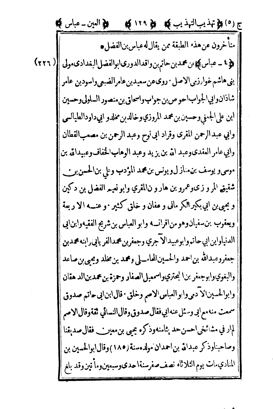 226 - "4 – عباس" بن محمد بن حاتم بن واقد الدوري أبو الفضل البغدادي مولى بني هاشم خوارزمي الأصل روى عن سعيد بن عامر الضبعي وأسود بن عامر شاذان وأبي الجواب أحوص بن جواب وإسحاق بن منصور السلولي وحسين بن علي الجعفي وحسين بن محمد المروزي وخالد بن مخلد وأبي داود الطيالسي وأبي عبد الرحمن المقري وقراد أبي نوح وعبد الرحمن بن مصعب القطان وأبي عامر العقدي وعبد الله بن يزيد وعبد الوهاب الخفاف وعبيد الله بن موسى ويوسف بن منازل ويونس بن محمد المؤدب وعلي بن الحسن بن شقيق المروزي وعمرو بن هارون المقري وأبو نعيم الفضل بن دكين ويحيى بن أبي بكير الكرماني وعفان وخلق كثير وعنه الأربعة ويعقوب بن سفيان وهو من أقرانه وأبو العباس بن شريح الفقيه وابن أبي الدنيا وابن أبي حاتم وأبو عبيد الآجري وجعفر بن محمد الفريابي وابنه محمد بن جعفر وعبيد الله بن أحمد والحسين المحاملي ومحمد بن مخلد ويحيى بن صاعد والبغوي وأبو جعفر بن البحتري وإسماعيل الصفار وحمزة بن محمد بن الدهقان وأبو الحسين الآدمي وأبو العباس الأصم وخلق قال ابن أبي حاتم صدوق سمعت منه مع أبي وسئل عنه أبي فقال صدوق وقال النسائي ثقة وقال الأصم لم أر في مشائخي أحسن حديثا منه وذكره يحيى بن معين فقال صديقنا وصاحبنا وذكر عبد الله بن أحمد أن مولدة سنة 185 وقال أبو الحسين بن المنادي مات يوم الثلاثاء نصف صفر سنة إحدى وسبعين ومائتين وقد بلغ