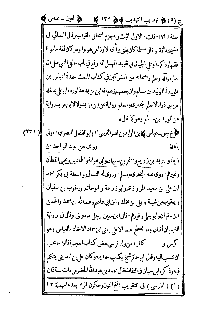 231 - "خ م س – عباس" بن الوليد بن نصر النرسي1 أبو الفضل البصري مولى باهلة روى عن عبد الواحد بن زياد ويزيد بن زريع ومعتمر بن سليمان وأبي عوانة والحمادين ويحيى القطان وغيرهم روى عنه البخاري ومسلم وروى له النسائي بواسطة أبي بكر أحمد بن علي بن سعيد المروزي وأبو زرعة وأبو حاتم ويعقوب بن سفيان ويعقوب بن شيبة وبقي بن مخلد وابن أبي عاصم وعبد الله بن أحمد والحسن بن سفيان وأبو يعلى وغيرهم قال ابن معين رجل صدوق وقال في رواية النرسيان ثقتان وما يصلح عبد الأعلى يعني ابن حماد إلا خادما لعباس وهو كيس وكافرا من ولد نرسي بعض كتاب المعجم فقالوا ما نحب أن ننسب إليه وقال أبو حاتم شيخ يكتب حديثه وكان علي بن المديني يتكلم فيه وذكره ابن حبان في الثقات قال محمد بن عبد الله الحضرمي مات سنة ثمان