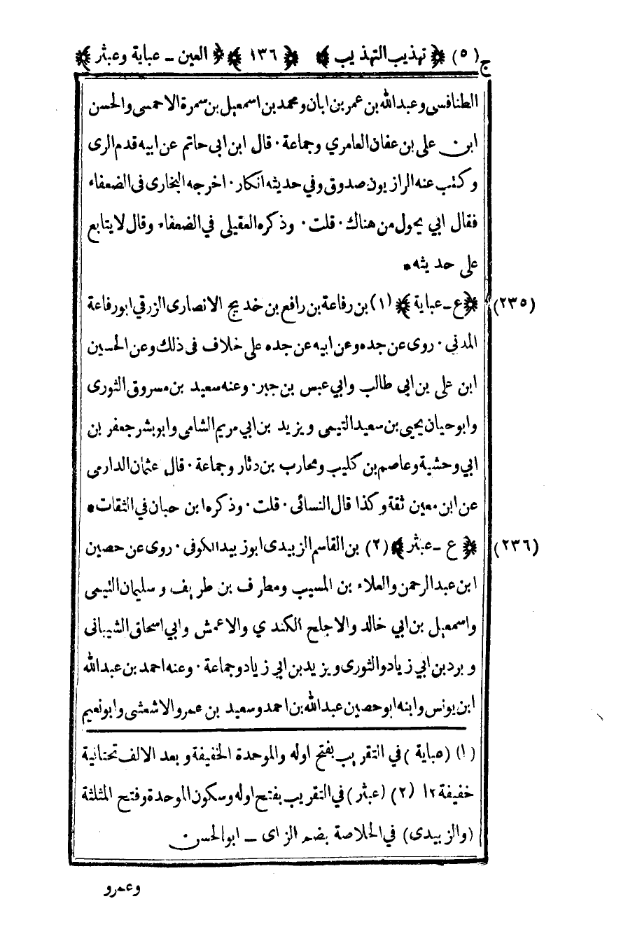 235 - "ع – عباية] 1 بن رفاعة بن رافع بن خديج الأنصاري الزرقي أبو رفاعة المدني روى عن جده وعن أبيه عن جده على خلاف في ذلك وعن الحسين بن علي بن أبي طالب وأبي عبس بن جبر وعنه سعيد بن مسروق الثوري وأبو حيان يحيى بن سعيد التيمي ويزيد بن أبي مريم الشامي وأبو بشر جعفر بن أبي وحشية وعاصم بن كليب ومحارب بن دثار وجماعة قال عثمان الدارمي عن ابن معين ثقة وكذا قال النسائي قلت وذكره ابن حبان في الثقات.