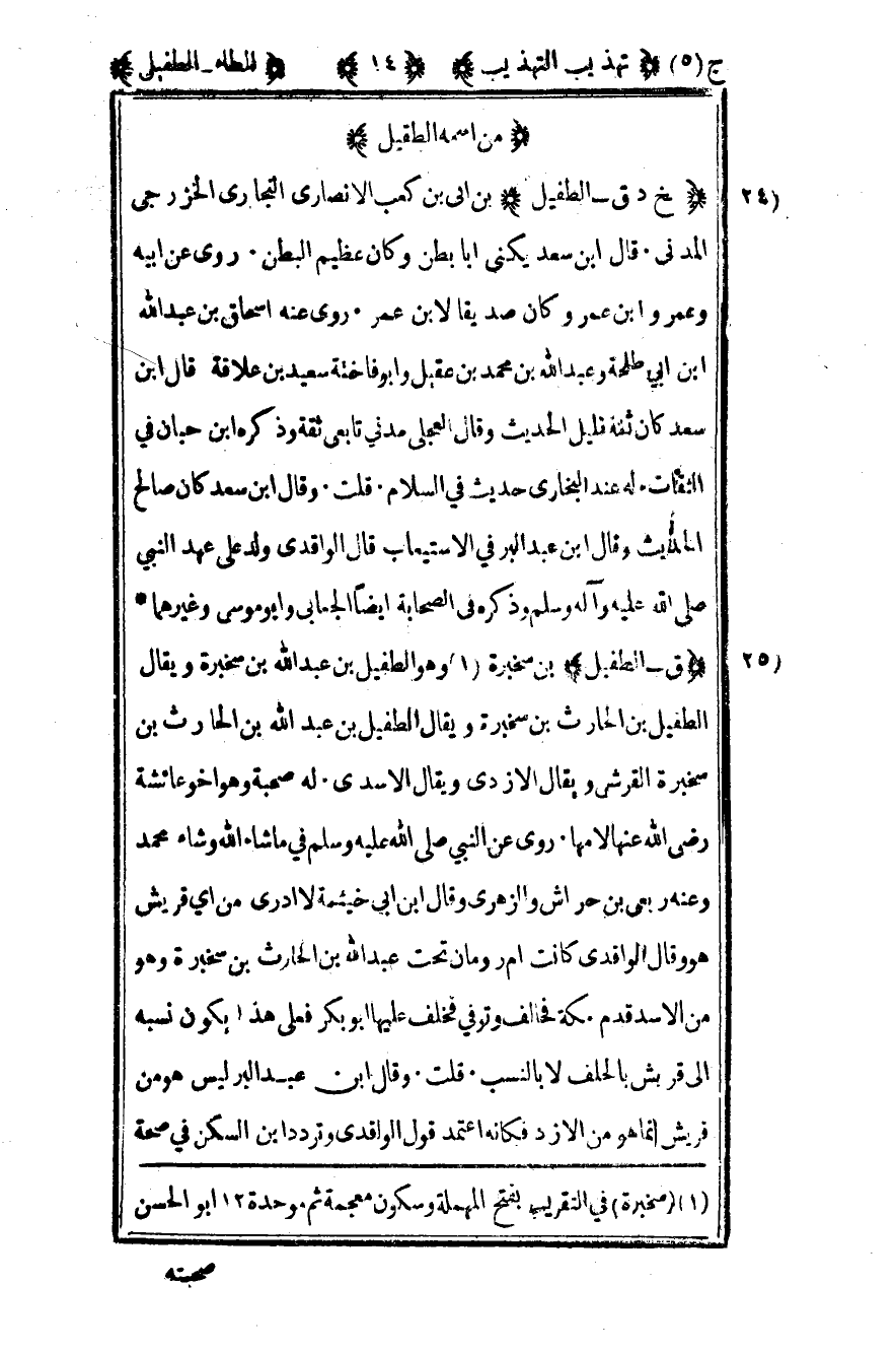 25 - "ق – الطفيل" بن سخبرة1 وهو الطفيل بن عبد الله بن سخبرة ويقال الطفيل بن الحارث بن سخبرة ويقال الطفيل بن عبد الله بن الحارث بن سخبرة القرشي ويقال الأزدي ويقال الأسدي له صحبة وهو أخو عائشة رضى الله تعالى عنها لأمها روى عن النبي صلى الله عليه وسلم في ما شاء الله وشاء محمد وعنه ربعي بن خراش والزهري وقال ابن أبي خيثمة لا أدري من أي قريش هو وقال الواقدي كانت أم رومان تحت عبد الله بن الحارث بن سخبرة وهو من الأسد قدم مكة فحالف وتوفي فخلف عليها أبو بكر فعلى هذا يكون نسبه إلى قريش بالحلف لا بالنسب قلت وقال ابن عبد البر ليس هو من قريش إنما هو من الأزد فكأنه اعتمد قول الواقدي وتردد بن السكن في صحة