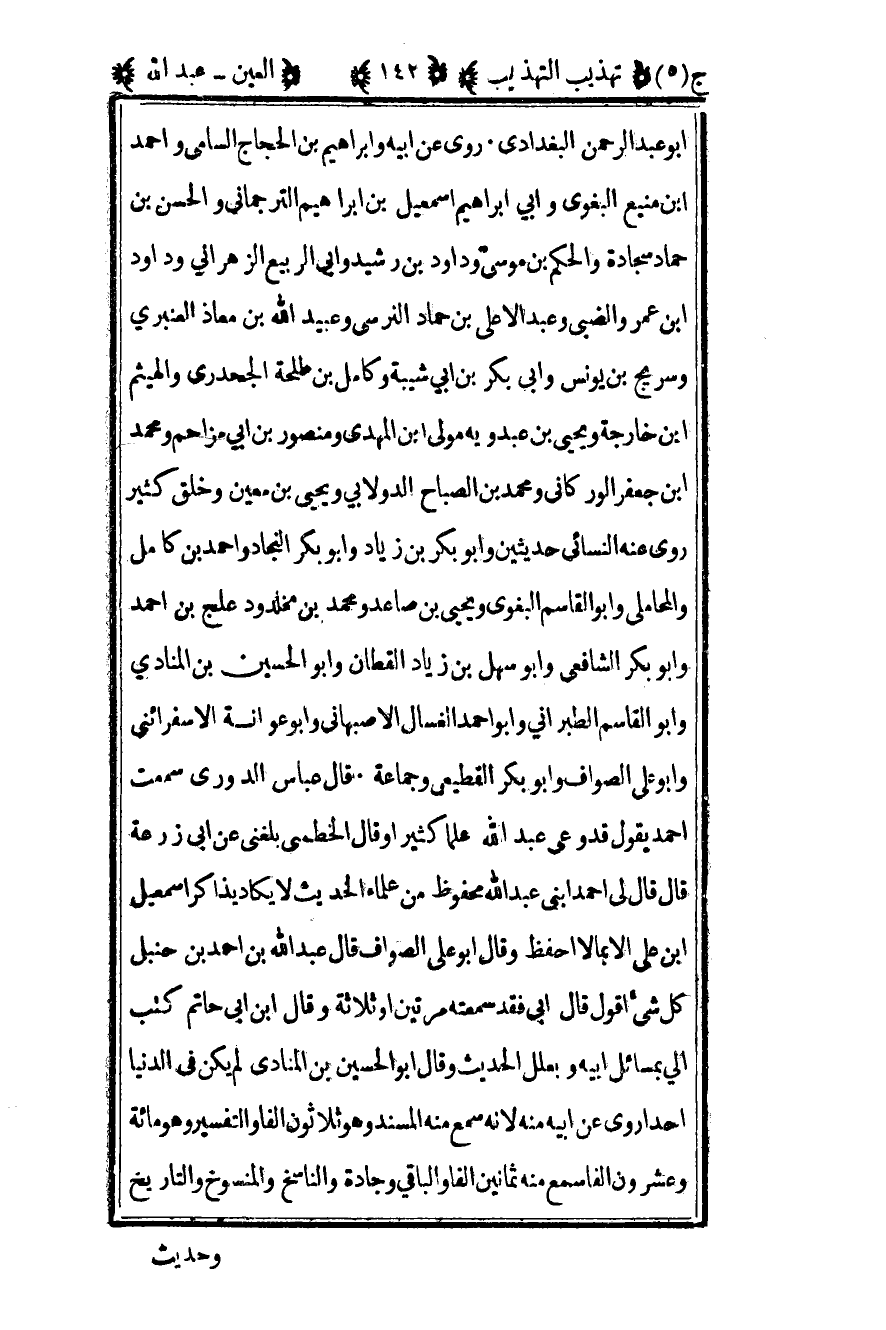 أبو عبد الرحمن البغدادي روى عن أبيه وإبراهيم بن الحجاج السامي وأحمد بن منيع البغوي وأبي إبراهيم إسماعيل بن إبراهيم الترجماني والحسن بن حماد سجادة والحكم بن موسى وداود بن رشيد وأبي الربيع الزهراني وداود بن عمرو الضبي وعبد الأعلى بن حماد النرسي وعبيد الله بن معاذ العنبري وسريج بن يونس وأبي بكر بن أبي شيبة وكامل بن طلحة الجحدري والهيثم بن خارجة ويحيى بن عبدويه مولى بن المهدي ومنصور بن أبي مزاحم ومحمد بن جعفر الوركاني ومحمد بن الصباح الدولابي ويحيى بن معين وخلق كثير روى عنه النسائي حديثين وأبو بكر بن زياد وأبو بكر النجاد وأحمد بن كامل والمحاملي وأبو القاسم البغوي ويحيى بن صاعد ومحمد بن مخلد ودعلج بن أحمد وأبو بكر الشافعي وأبو سهل بن زياد القطان وأبو الحسين بن المنادي وأبو القاسم الطبراني وأبو أحمد الغسال الأصبهاني وأبو عوانة الإسفرائيني وأبو علي الصواف وأبو بكر القطيعي وجماعة قال عباس الدوري سمعت أحمد يقول قد وعى عبد الله علما كثيرا وقال الخطمي بلغني عن أبي زرعة قال قال لي أحمد ابني عبد الله محفوظ من علماء الحديث لا يكاد يذاكر إسماعيل بن علي إلا بما لا أحفظ وقال أبو علي الصواف قال عبد الله بن أحمد بن حنبل كل شيء أقول قال أبي فقد سمعته مرتين أو ثلاثة وقال لابن أبي حاتم كتب إلي بمسائل أبيه وبعلل الحديث وقال أبو الحسين بن المنادي لم يكن في الدنيا أحدا روى عن أبيه منه لأنه سمع منه المسند وهو ثلاثون ألفا والتفسير وهو مائة وعشرون ألفا سمع منه ثمانين ألفا والباقي وجادة والناسخ والمنسوخ والتاريخ