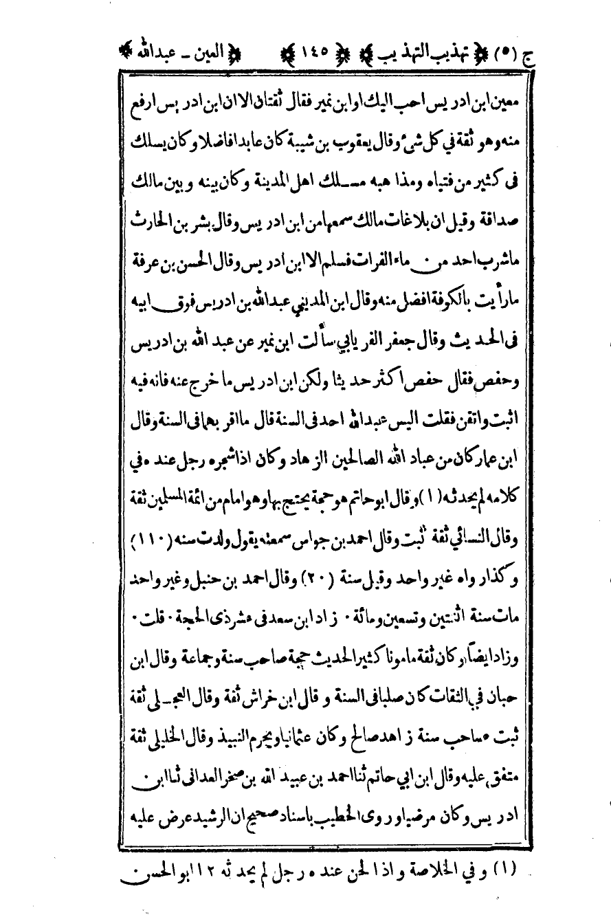 معين بن إدريس أحب إليك أو بن نمير فقال ثقتان إلا أن بن إدريس أرفع منه وهو ثقة في كل شيء وقال يعقوب بن شيبة كان عابدا فاضلا وكان يسلك في كثير من فتياه ومذاهبه مسلك أهل المدينة وكان بينه وبين مالك صداقة وقيل إن بلاغات مالك سمعها من بن إدريس وقال بشر بن الحارث ما شرب أحد من ماء الفرات فسلم إلا بن إدريس وقال الحسن بن عرفة ما رأيت بالكوفة أفضل منه وقال ابن المديني عبد الله بن إدريس فوق أبيه في الحديث وقال جعفر الفريابي سألت بن نمير عن عبد الله بن إدريس وحفص فقال حفص أكثر حديثا ولكن بن إدريس ما خرج عنه فإنه فيه أثبت وأتقن فقلت أليس عبد الله أحد في السنة قال ما أقربهما في السنة وقال ابن عمار كان من عباد الله الصالحين الزهاد وكان إذا شجره رجل عنده في كلامه لم يحدثه1 وقال أبو حاتم هو حجة يحتج بها وهو إمام من أئمة المسلمين ثقة وقال النسائي ثقة ثبت وقال أحمد بن جواس سمعته يقول ولدت سنة (11) وكذا رواه غير واحد وقيل سنة (2) وقال أحمد بن حنبل وغير واحد مات سنة اثنتين وتسعين ومائة زاد بن سعد في عشر ذي الحجة قلت وزاد أيضا وكان ثقة مأمونا كثير الحديث حجة صاحب سنة وجماعة وقال ابن حبان في الثقات كان صلبا في السنة وقال ابن خراش ثقة وقال العجلي ثقة ثبت صاحب سنة زاهد صالح وكان عثمانيا ويحرم النبيذ وقال الخليلي ثقة متفق عليه وقال ابن أبي حاتم ثنا أحمد بن عبيد الله بن صخر العداني ثنا بن إدريس وكان مرضيا وروى الخطيب بإسناد صحيح أن الرشيد عرض عليه