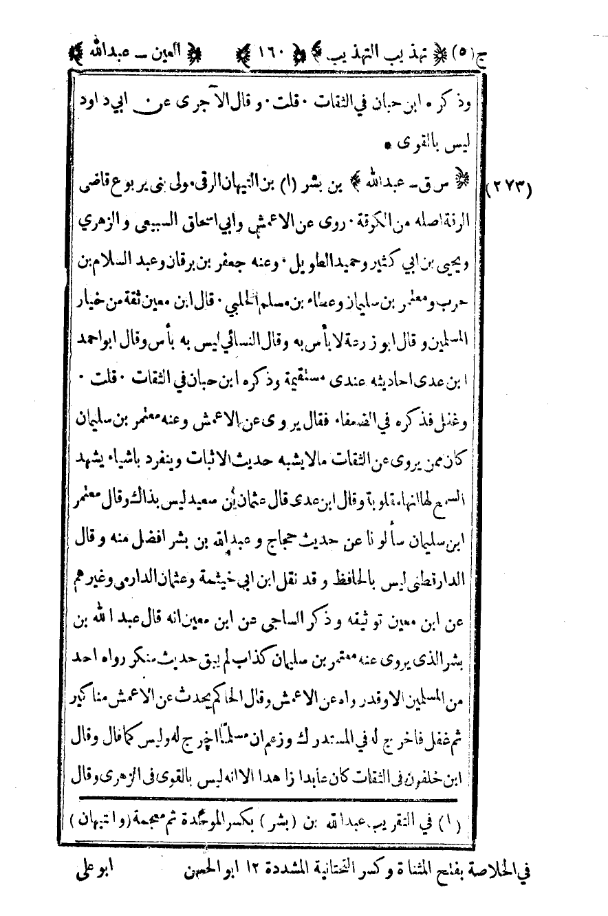 1في التقريب عبد الله بن "بشر" بكسر الموحدة ثم معجمه "واشيهان" في الخلاصة بفتح المثناة وكسر التحتانية المشددة 12 أبو الحسن
