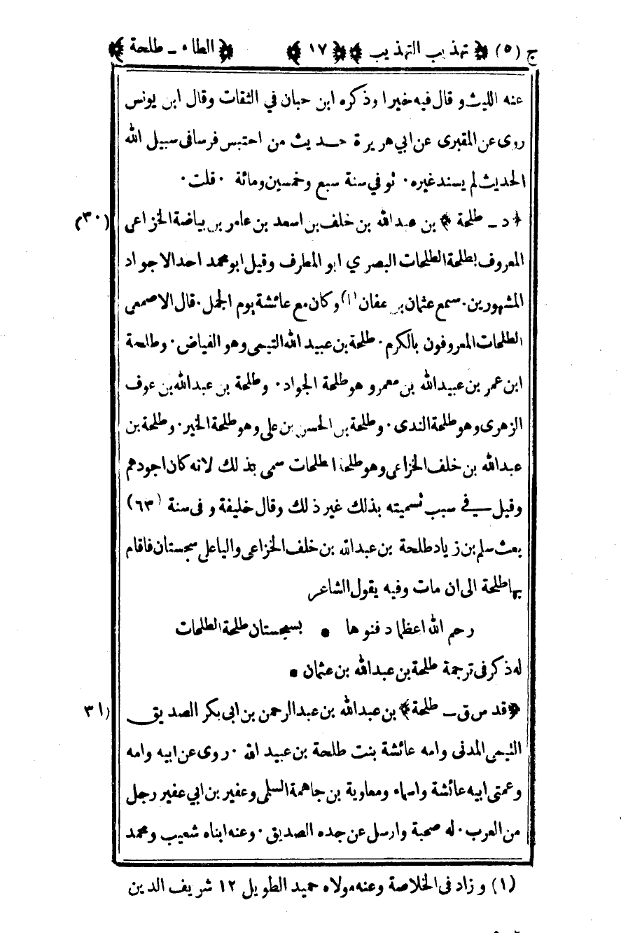 31 - "قد س ق – طلحة" بن عبد الله بن عبد الرحمن بن أبي الصديق التيمي المدني وأمه عائشة بنت طلحة بن عبيد الله روى عن أبيه وأمه وعمتي أبيه عائشة وأسماء ومعاوية بن جامعة السلمي وعفير بن أبي عفير رجل من العرب له صحبة وأرسل عن جده الصديق وعنه ابنه شعيب ومحمد
