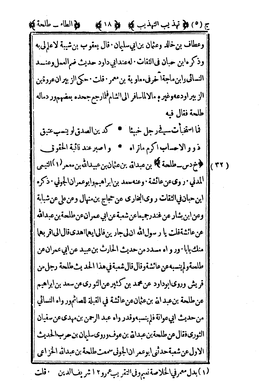 32 - "خ د س – طلحة" بن عبد الله بن عثمان بن عبيد الله بن معمر1 التيمي المدني روى عن عائشة وعنه سعد بن إبراهيم وأبو عمران الجوني ذكره ابن حبان في الثقات روى البخاري عن حجاج بن منهال وعن علي عن شبابة وعن ابن بشار عن غندر جميعا عن شعبة عن أبي عمران عن طلحة بن عبد الله عن عائشة قلت يا رسول الله إن لي جارين فإلى أيهما أهدي قال: "إلى أقربهما منك باب" ورواه مسدد من حديث الحارث بن عبيد الله عن أبي عمران عن طلحة ولم ينسبه عن عائشة وقال قال شعبة في هذا الحديث طلحة رجل من قريش وروى أبو داود عن محمد بن كثير عن الثوري عن سعد بن إبراهيم عن طلحة بن عبد الله بن عثمان عن عائشة في القبلة للصائم ورواه النسائي من حديث أبي عوانة فلم ينسبه وقد رواه عبد الرحمن بن مهدي عن سفيان الثوري فقال عن طلحة بن عبد الله بن عوف وروى سليمان بن حرب الحديث الأول عن شعبة حدثني أبو عمران الجوني سمعت طلحة بن عبد الله الخزاعي