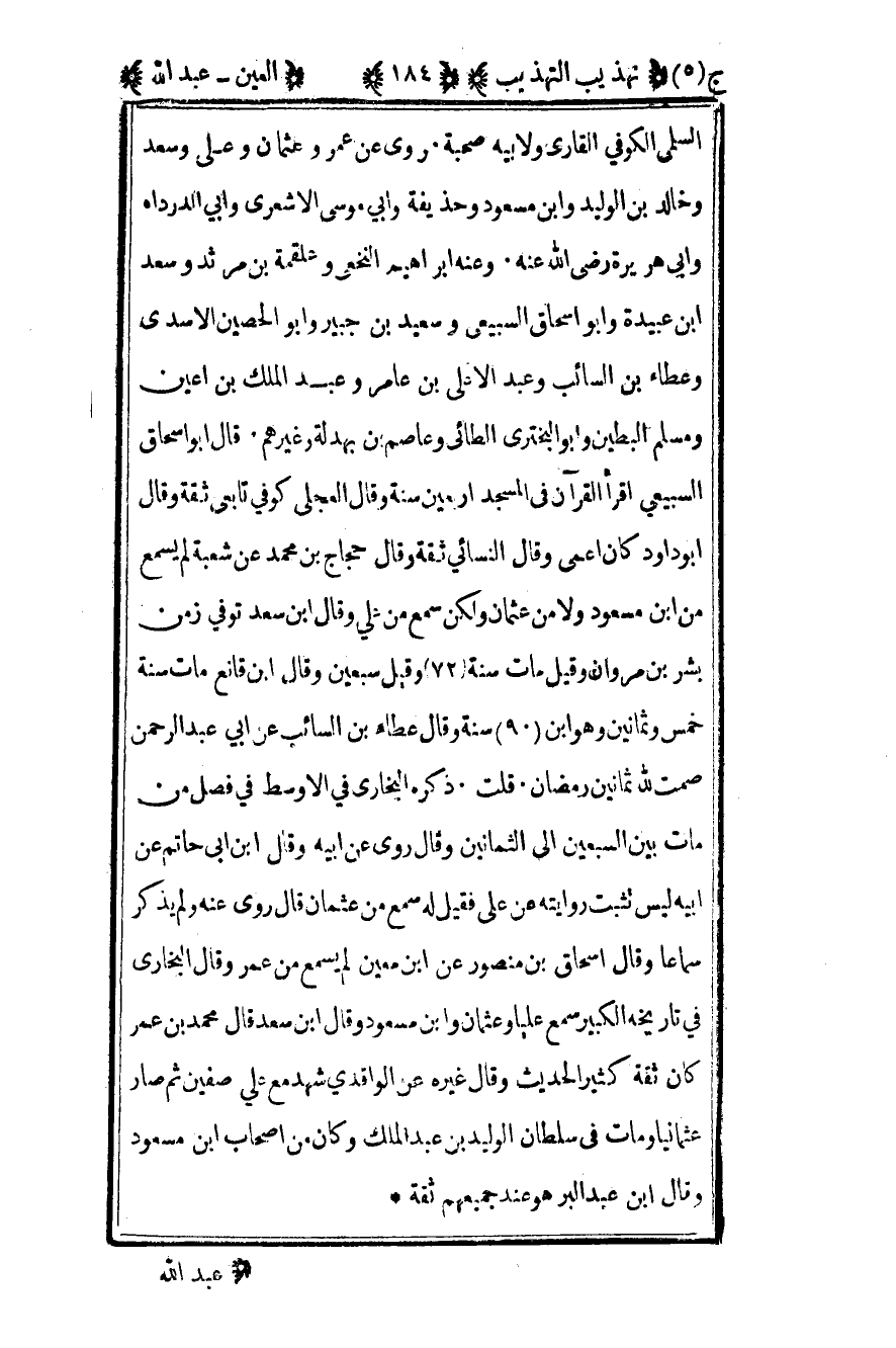 السلمي الكوفي القاري ولأبيه صحبة روى عن عمر وعثمان وعلي وسعد وخالد بن الوليد وابن مسعود وحذيفة وأبي موسى الأشعري وأبي الدرداء وأبي هريرة رضى الله تعالى عنه وعنه إبراهيم النخعي وعلقمة بن مرثد وسعد بن عبيدة وأبو إسحاق السبيعي وسعيد بن جبير وأبو الحصين الأسدي وعطاء بن السائب وعبد الأعلى بن عامر وعبد الملك بن أعين ومسلم البطين وأبو البختري الطائي وعاصم بن بهدلة وغيرهم قال أبو إسحاق السبيعي اقرأ القرآن في المسجد أربعين سنة وقال العجلي كوفي تابعي ثقة وقال أبو داود كان أعمى وقال النسائي ثقة وقال حجاج بن محمد عن شعبة لم يسمع من بن مسعود ولا من عثمان ولكن سمع من علي وقال ابن سعد توفي زمن بشر بن مروان وقيل مات سنة 72 وقيل سبعين وقال ابن قانع مات سنة خمس وثمانين وهو ابن 9 سنة وقال عطاء بن السائب عن أبي عبد الرحمن صمت لله ثمانين رمضان قلت ذكره البخاري في الأوسط في فصل من مات بين السبعين إلى الثمانين وقال روى عن أبيه وقال ابن أبي حاتم عن أبيه ليس تثبت روايته عن علي فقيل له سمع من عثمان قال روى عنه ولم يذكر سماعا وقال إسحاق بن منصور عن أبي معين لم يسمع من عمر وقال البخاري في تاريخه الكبير سمع عليا وعثمان وابن مسعود وقال ابن سعد قال محمد بن عمر كان ثقة كثير الحديث وقال غيره عن الواقدي شهد مع علي صفين ثم صار عثمانيا ومات في سلطان الوليد بن عبد الملك وكان من أصحاب بن مسعود وقال ابن عبد البر هو عند جميعهم ثقة