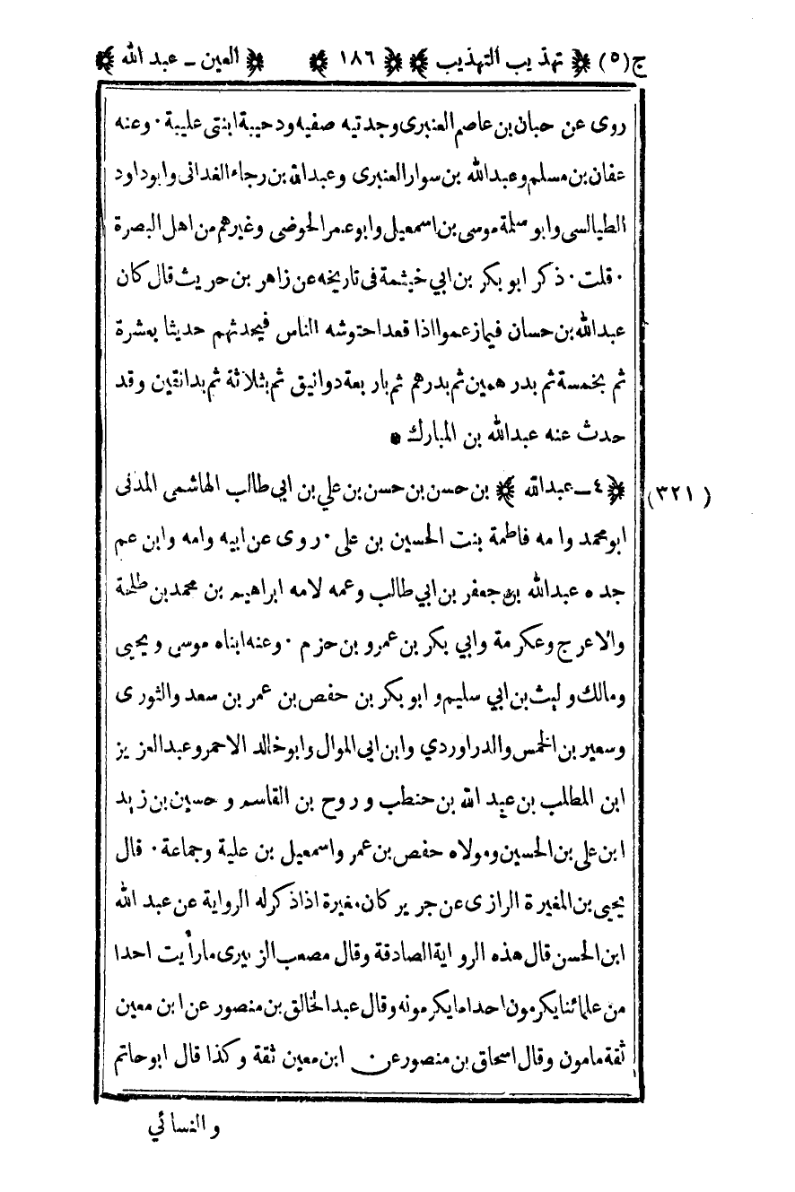 321 - "4 - عبد الله" بن حسن بن حسن بن علي بن أبي طالب الهاشمي المدني أبو محمد وأمه فاطمة بنت الحسين بن علي روى عن أبيه وأمه وابن عم جده عبد الله بن جعفر بن أبي طالب وعمه لأمه إبراهيم بن محمد بن طلحة والأعرج وعكرمة وأبي بكر بن عمرو بن حزم وعنه أبناه موسى ويحيى ومالك وليث بن أبي سليم وأبو بكر بن حفص بن عمر بن سعد والثوري وسعيد بن الخمس والداروردي وابن أبي الموال وأبو خالد الأحمر وعبد العزيز بن المطلب بن عبد الله بن حنطب وروح بن القاسم وحسين بن زيد بن علي بن الحسين ومولاه حفص بن عمر وإسماعيل بن علية وجماعة قال يحيى بن المغيرة الرازي عن جرير كان مغيرة إذا ذكر له الرواية عن عبد الله بن الحسن قال هذه الرواية الصادقة وقال مصعب الزبيري ما رأيت أحدا من علمائنا يكرمون أحدا ما يكرمونه وقال عبد الخالق بن منصور عن ابن معين ثقة مأمون وقال إسحاق بن منصور عن ابن معين ثقة وكذا قال أبو حاتم