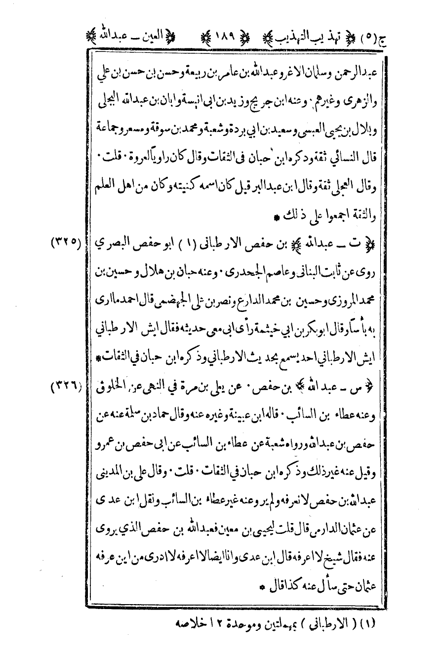 325 - "ت - عبد الله" بن حفص الأرطباني أبو حفص البصري روى عن ثابت البناني وعاصم الجحدري وعنه حبان بن هلال وحسين بن محمد المروزي وحسين بن محمد الدارع ونصر بن علي الجهضمي قال أحمد ما أرى به بأسا وقال أبو بكر بن أبي خيثمة رأى أبي معي حديثه فقال إيش الأرطباني إيش الأرطباني أحد يسمع بحديث الأرطباني وذكره ابن حبان في الثقات.