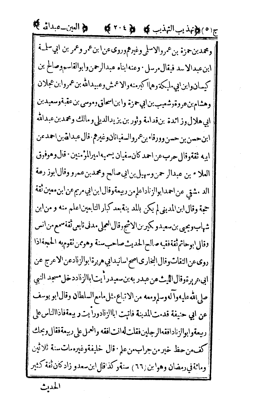 ومحمد بن حمزة بن عمرو الأسلمي وغيرهم وروى عن ابن عمر وعمر بن أبي سلمة بن عبد الأسد فيقال مرسل وعنه أبناه عبد الرحمن وأبو القاسم وصالح بن كيسان وابن أبي مليكة وهما أكبر منه والأعمش وعبيد الله بن عمر وابن عجلان وهشام بن عروة وشعيب بن أبي حمزة وابن إسحاق وموسى بن عقبة وسعيد بن أبي هلال وزائدة بن قدامة وثور بن يزيد الديلي ومالك ومحمد بن عبد الله بن حسن بن حسن وورقاء بن عمر والسفيانان وغيرهم قال عبد الله بن أحمد عن أبيه ثقة وقال حرب عن أحمد كان سفيان يسميه أمير المؤمنين قال وهو فوق العلاء بن عبد الرحمن وسهيل بن أبي صالح ومحمد بن عمرو وقال أبو زرعة الدمشقي عن أحمد أبو الزناد أعلم من ربيعة وقال ابن أبي مريم عن ابن معين ثقة حجة وقال ابن المديني لم يكن بالمدينة بعد كبار التابعين أعلم منه ومن بن شهاب ويحيى بن سعيد وبكير بن الأشج وقال العجلي مدني تابعي ثقة سمع من أنس وقال أبو حاتم ثقة فقيه صالح الحديث صاحب سنة وهو ممن تقوم به الحجة إذا روى عن الثقات وقال البخاري أصح أسانيد أبي هريرة أبو الزناد عن الأعرج عن أبي هريرة وقال الليث عن عبد ربه بن سعيد رأيت أبا الزناد دخل مسجد النبي صلى الله عليه وسلم ومعه من الأتباع مثل ما مع السلطان وقال أبو يوسف عن أبي حنيفة قدمت المدينة فأتيت أبا الزناد ورأيت ربيعة فإذا الناس على ربيعة وأبو الزناد أفقه الرجلين فقلت له أنت أفقه والعمل على ربيعة فقال ويحك كف من حظ خير من جراب من علم قال خليفة وغيره مات سنة ثلاثين ومائة في رمضان وهو ابن 66 سنة وكذا قال ابن سعد وزاد كان ثقة كثير