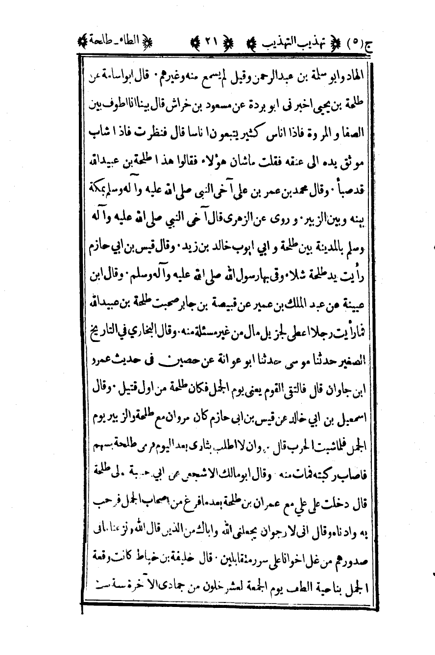 الهاد وأبو سلمة بن عبد الرحمن وقيل لم يسمع منه وغيرهم قال أبو أسامة عن طلحة بن يحيى أخبرني أبو بردة عن مسعود بن خراش قال بينا أنا أطوف بين الصفا والمروة فإذا أناس كثير يتبعون أناسا قال فنظرت فإذا شاب موثق يده إلى عنقه فقلت ما شأن هؤلاء فقال هذا طلحة بن عبيد الله قد صبأ وقال محمد بن عمر بن علي آخى النبي صلى الله عليه وسلم بمكة بينه وبين الزبير وروى عن الزهري قال آخى النبي صلى الله عليه وسلم بالمدينة بين طلحة وأبي أيوب خالد بن زيد وقال قيس بن أبي حازم رأيت يد طلحة شلاء وقى بها رسول الله صلى الله عليه وسلم وقال ابن عيينة عن عبد الملك بن عمير عن قبيصة بن جابر صحبت طلحة بن عبيد الله فما رأيت رجلا أعطى لجزيل مال من غير مسألة منه وقال البخاري في التاريخ الصغير حدثنا موسى حدثنا أبو عوانة عن حصين في حديث عمرو بن جلوان قال فالتقى القوم يعني يوم الجمل فكان طلحة من أول قتيل وقال إسماعيل بن أبي خالد عن قيس بن أبي حازم كان مروان مع طلحة والزبير يوم الجمل فلما شبت الحرب قال وأن لا أطلب بثأري بعد اليوم فرمى طلحة بسهم فأصاب ركبته فمات منه وقال أبو مالك الأشجعي عن أبي حبيبة مولى طلحة قال دخلت على علي مع عمران بن طلحة بعدما فرغ من أصحاب الجمل فرحب به وأدناه وقال إني لأرجو أن يجعلني الله وإياك من الذين قال الله ونزعنا ما في صدورهم من غل أخوانا على سرر متقابلين قال خليفة بن خياط كانت وقعة الجمل بناحية الطف يوم الجمعة لعشر خلون من جمادى الآخرة سنة ست