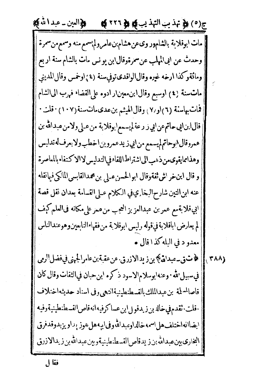 مات أبو قلابة بالشام وروى عن هشام بن عامر ولم يسمع منه وسمع من سمرة وحدث عن أبي الملهب عن سمرة وقال ابن يونس مات بالشام سنة أربع ومائة وكذا أرخه غيره وقال الواقدي توفي سنة 4 أو خمس وقال المديني مات سنة 4 أو سبع وقال ابن معين أرادوه على القضاء فهرب إلى الشام فمات بها سنة 6 أو 7 وقال الهيثم بن عدي مات سنة 107 قلت قال ابن أبي حاتم عن أبي زرعة لم يسمع أبي قلابة من علي ولا من عبد الله بن عمر وقال أبو حاتم لم يسمع من أبي زيد عمرو بن أخطب ولا يعرف له تدليس وهذا مما يقوي من ذهب إلى اشتراط اللقاء في التدليس لا الاكتفاء بالمعاصرة وقال ابن خراش ثقة وقال أبو الحسن علي بن محمد القابسي المالكي فيما نقله عنه بن التين شارح البخاري في الكلام على القسامة بعد أن نقل قصة أبي قلابة مع عمر بن عبد العزيز العجب من عمر على مكانه في العلم كيف لم يعارض أبا قلابة في قوله وليس أبو قلابة من فقهاء التابعين وهو عند الناس معدود في البله كذا قال.