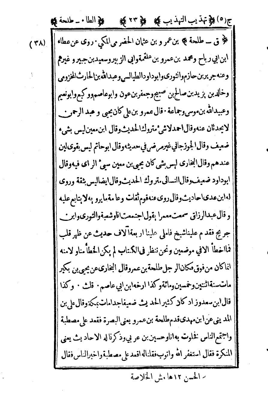 38 - "ق – طلحة" بن عمرو بن عثمان الحضرمي المكي روى عن عطاء بن أبي رباح ومحمد بن عمرو بن علقمة وأبي الزبير وسعيد بن جبير وغيرهم وعنه جرير بن حازم والثوري وأبو داود الطيالسي وعبد الله بن الحارث المخزومي وخالد بن يزيد بن صالح بن صبيح وجعفر بن عون وأبو عاصم ووكيع وأبو نعيم وعبيد الله بن موسى وجماعة قال عمرو بن علي كان يحيى وعبد الرحمن لا يحدثان عنه وقال أحمد لا شيء متروك الحديث وقال ابن معين ليس بشيء ضعيف وقال الجوزجاني غير مرضي في حديثه وقال أبو حاتم ليس بقوي لين عندهم وقال البخاري ليس بشيء كان يحيى بن معين سيء الرأي فيه وقال أبو داود ضعيف وقال النسائي متروك الحديث وقال أيضا ليس بثقة وروى له بن عدي أحاديث وقال روى عنه قوم ثقات وعامة ما يرويه لا يتابع عليه وقال عبد الرزاق سمعت معمرا يقول اجتمعت أنا وشعبة والثوري وابن جريج فقدم علينا شيخ فأملى علينا أربعة آلاف حديث عن ظهر قلب فما أخطأ إلا في موضعين ونحن ننظر في الكتاب لم يكن الخطأ منا ولا منه إنما كان من فوق فكان الرجل طلحة بن عمر وقال البخاري عن يحيى بن بكير مات سنة اثنتين وخمسين ومائة وكذا أرخه بن أبي عاصم قلت وكذا قال ابن سعد وزاد كان كثير الحديث ضعيفا جدا مات بمكة وقال علي بن المديني عن ابن مهدي قدم طلحة بن عمرو يعني البصرة فقعد على مصطبة واجتمع الناس فخلوت به أنا وحسين بن عربي وذكرنا له الأحاديث يعني المنكرة فقال استغفر الله وأتوب فقلنا له أقعد على مصطبة وأخبر الناس فقال