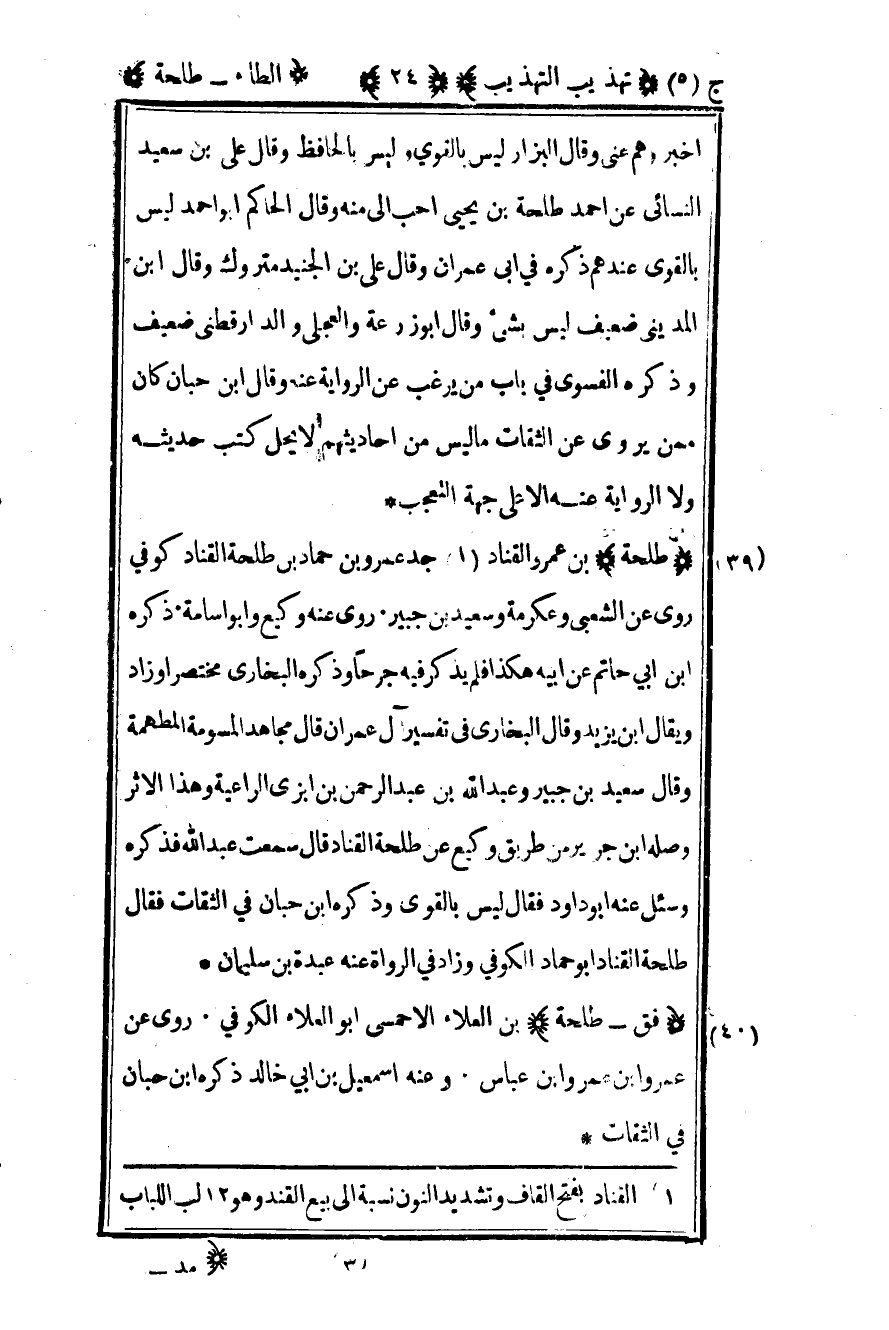 39 - "طلحة" بن عمرو القناد1 جد عمرو بن حماد بن طلحة القناد كوفي روى عن الشعبي وعكرمة وسعيد بن جبير روى عنه وكيع وأبو أسامة ذكره ابن أبي حاتم عن أبيه هكذا فلم يذكر فيه جرحا وذكره البخاري مختصر أو زاد ويقال ابن يزيد وقال البخاري في تفسير آل عمران قال مجاهد المسومة المطهمة وقال سعيد بن جبير وعبد الله بن عبد الرحمن بن أبزى الراعية وهذا الأثر وصله بن جرير من طريق وكيع عن طلحة القناد قال سمعت عبد الله فذكره وسئل عنه أبو داود فقال ليس بالقوي وذكره ابن حبان في الثقات فقال طلحة القناد أبو حماد الكوفي وزاد في الرواة عنه عبدة بن سليمان