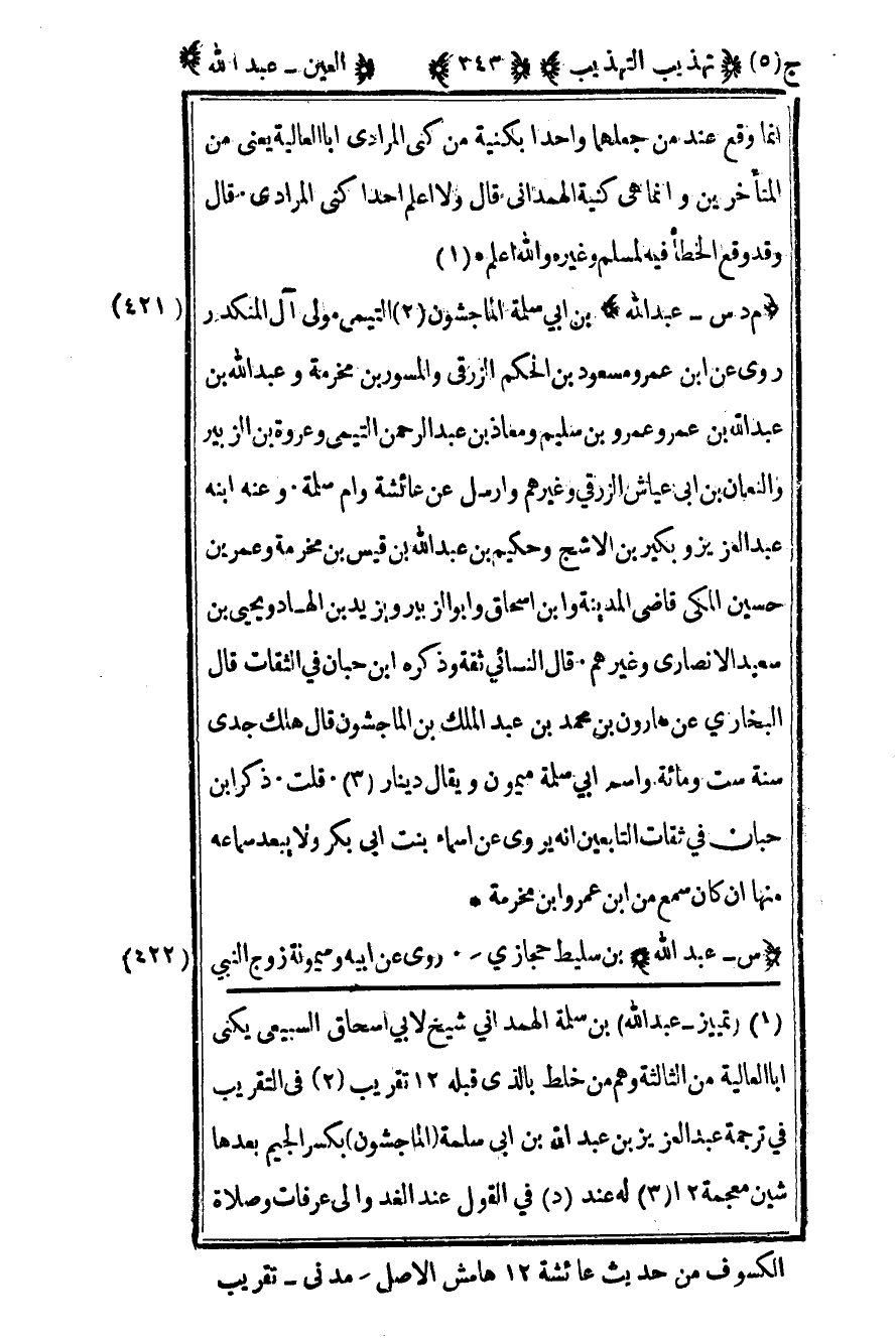 421 - "م د س - عبد الله" بن أبي سلمة الماجشون2 التيمي مولى آل المنكدر روى عن ابن عمر ومسعود بن الحكم الزرقي والمسور بن مخرمة وعبد الله بن عبد الله بن عمر وعمرو بن سليم ومعاذ بن عبد الرحمن التيمي وعروة بن الزبير والنعمان بن أبي عياش الزرقي وغيرهم وأرسل عن عائشة وأم سلمة وعنه ابنه عبد العزيز وبكير بن الأشج وحكيم بن عبد الله بن قيس بن مخرمة وعمر بن حسين المكي قاضي المدينة وابن إسحاق وأبو الزبير ويزيد بن الهاد ويحيى بن سعيد الأنصاري وغيرهم قال النسائي ثقة وذكره ابن حبان في الثقات قال البخاري عن هارون بن محمد بن عبد الملك بن الماجشون قال هلك جدي سنة ست ومائة واسم أبي سلمة ميمون ويقال دينار3 قلت ذكر بن حبان في ثقات التابعين أنه يروي عن أسماء بنت أبي بكر ولا يبعد سماعه منها إن كان سمع من بن عمر وابن مخرمة.
