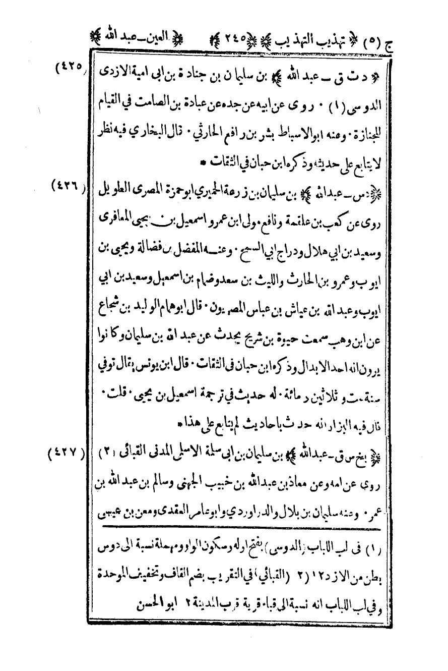 425 - "د -عبد الله" بن سليمان بن جنادة بن أبي أمية الأزدي الدوسي1 روى عن أبيه عن جده عن عبادة بن الصامت في القيام للجنازة وعنه أبو الأسباط بشر بن رافع الحارثي قال البخاري فيه نظر لا يتابع على حديثه وذكره ابن حبان في الثقات.