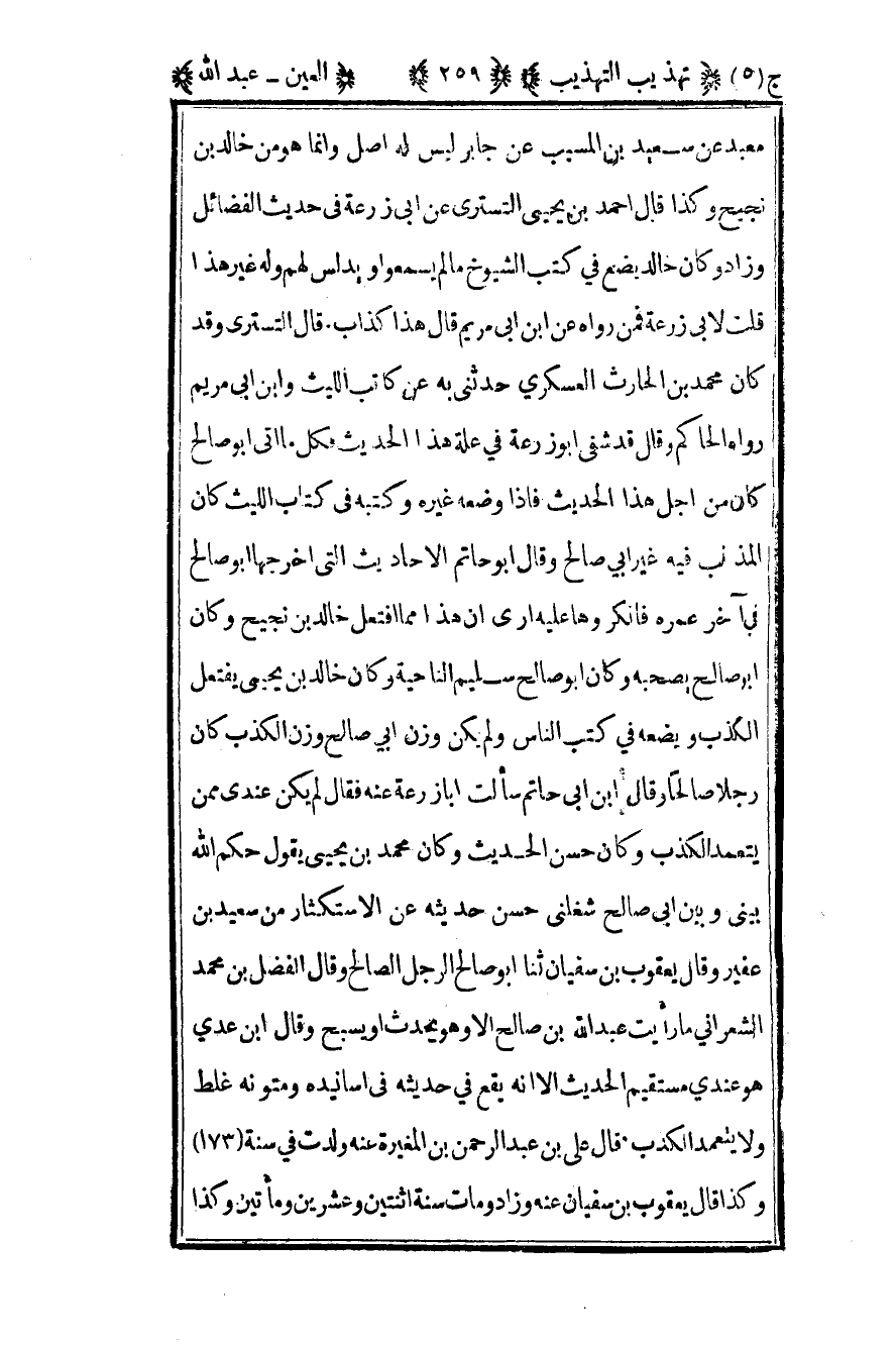 معبد عن سعيد بن المسيب عن جابر ليس له أصل وإنما هو من خالد بن نجيح كذا قال أحمد بن يحيى التستري عن أبي زرعة في حديث الفضائل وزاد وكان خالد يضع في كتب الشيوخ ما لم يسمعوا ويدلس لهم وله غير هذا قلت لأبي زرعة فمن رواه عن ابن أبي مريم قال هذا كذاب قال التستري وقد كان محمد بن الحارث العسكري حدثني به عن كاتب الليث وابن أبي مريم رواه الحاكم وقال قد شفى أبو زرعة في علة هذا الحديث فكل ما أتى أبو صالح كان من أجل هذا الحديث فإذا وضعه غيره وكتبه في كتاب الليث كان المذنب فيه غير أبو صالح وقال أبو حاتم الأحاديث التي أخرجها أبو صالح في آخر عمره فأنكروها عليه أرى أن هذا مما افتعل خالد بن نجيح وكان أبو صالح يصحبه وكان أبو صالح سليم الناحية وكان خالد بن يحيى يفتعل الكذب ويضعه في كتب الناس ولم يكن وزن أبي صالح وزن الكذب كان رجلا صالحا قال ابن أبي حاتم سألت أبا زرعة عنه فقال لم يكن عندي ممن يتعمد الكذب وكان حسن الحديث وكان محمد بن يحيى يقول حكم الله بيني وبين أبي صالح شغلني حسن حديثه عن الاستكثار من سعيد بن عفير وقال يعقوب بن سفيان ثنا أبو صالح الرجل الصالح وقال الفضل بن محمد الشعراني ما رأيت عبد الله بن صالح إلا وهو بحدث أو يسبح وقال ابن عدي هو عندي مستقيم الحديث إلا أنه يقع في حديثه في أسانيده ومتونه غلط ولا يتعمد الكذب قال علي بن عبد الرحمن بن المغيرة عنه ولدت في سنة 173 وكذا قال يعقوب بن سفيان عنه وزاد ومات سنة اثنتين وعشرين ومائتين وكذا