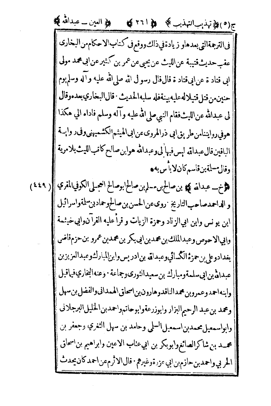 449 - "خ - عبد الله" بن صالح بن مسلم بن صالح أبو صالح العجلي الكوفي المقري والد أحمد صاحب التاريخ روى عن الحسن بن صالح وحماد بن سلمة وإسرائيل بن يونس وابن أبي الزناد وحمزة الزيات وقرأ عليه القرآن وأبي خيثمة وأبي الأحوص وعبد الملك بن محمد بن أبي بكر بن محمد بن عمرو بن حزم قاضي بغداد وعلي بن حمزة الكسائي وعبد الله بن إدريس وابن المبارك وعبد العزيز بن عبد الله بن أبي سلمة ومبارك بن سعيد الثوري وجماعة وعنه البخاري فيما قيل وابنه أحمد وعمرو بن محمد الناقد وهارون بن إسحاق الهمداني والفضل بن سهل ومحمد بن عبد الرحيم البزار وأبو زرعة وأبو حاتم وأحمد بن الخليل البرجلاني وأبو إسماعيل محمد بن إسماعيل السلمي وحامد بن سهل الثغري وجعفر بن محمد بن شاكر الصائغ وأبو بكر بن أبي عتاب الأعين وإبراهيم بن إسحاق الحربي وأحمد بن حازم بن أبي عزرة وغيرهم قال الأثرم عن أحمد كان يحدث