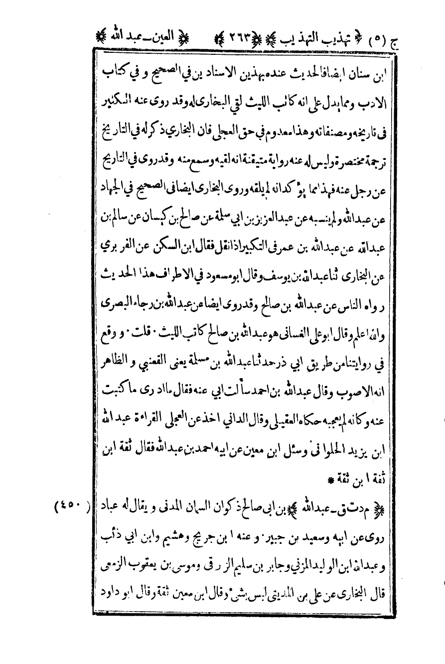 450 - "م د ت ق - عبد الله" بن صالح ذكوان السمان المدني ويقال له عباد روى عن أبيه وسعيد بن جبير وعنه بن جريج وهشيم وابن أبي ذئب وعبد الله بن الوليد المزني وجابر بن سليم الزرقي وموسى بن يعقوب الزمعي قال البخاري عن علي بن المديني ليس بشيء وقال ابن معين ثقة وقال أبو داود