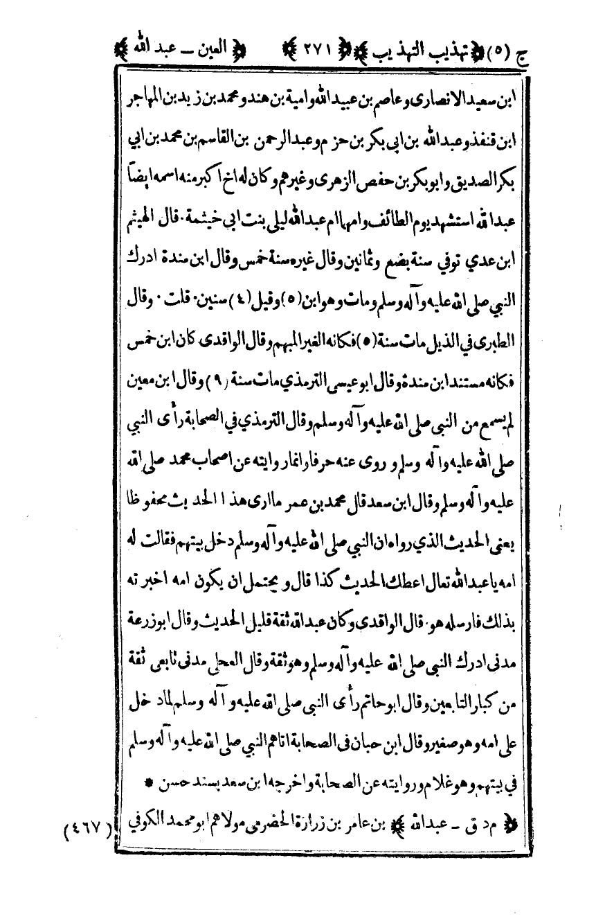 ابن سعيد الأنصاري وعاصم بن عبيد الله وأمية بن هند ومحمد بن زيد بن المهاجر بن قنفذ وعبد الله بن أبي بكر بن حزم عبد الرحمن بن القاسم بن محمد بن أبي بكر الصديق وأبو بكر بن حفص الزهري وغيرهم وكان له أخ أكبر منه اسمه أيضا عبد الله استشهد يوم الطائف وأمهما أم عبد الله ليلى بنت أبي خيثمة قال الهيثم بن عدي توفي سنة بضع وثمانين وقال غيره سنة خمس وقال ابن مندة أدرك النبي صلى الله عليه وسلم ومات وهو ابن 5 وقيل 4 سنين قلت وقال الطبري في الذيل مات سنة 5 فكأنه الغير المبهم وقال الواقدي كان ابن خمس فكأنه مستند بن مندة وقال أبو عيسى الترمذي مات سنة 9 وقال ابن معين لم يسمع من النبي صلى الله عليه وسلم وقال الترمذي في الصحابة رأى النبي صلى الله عليه وسلم وروى عنه حرفا وإنما روايته عن أصحاب محمد صلى الله عليه وسلم وقال ابن سعد قال محمد بن عمر ما أرى هذا الحديث محفوظا يعني الحديث الذي رواه أن النبي صلى الله عليه وسلم دخل بيتهم فقالت له أمه يا عبد الله تعال أعطك الحديث كذا قال ويحتمل أن يكون أمه أخبرته بذلك فأرسله هو قال الواقدي وكان عبد الله ثقة قليل الحديث وقال أبو زرعة مدني أدرك النبي صلى الله عليه وسلم وهو ثقة وقال العجلي مدني تابعي ثقة من كبار التابعين وقال أبو حاتم رأى النبي صلى الله عليه وسلم لما دخل على أمه وهو صغير وقال ابن حبان في الصحابة أتاهم النبي صلى الله عليه وسلم في بيتهم وهو غلام وروايته عن الصحابة وأخرجه ابن سعد بسند حسن.