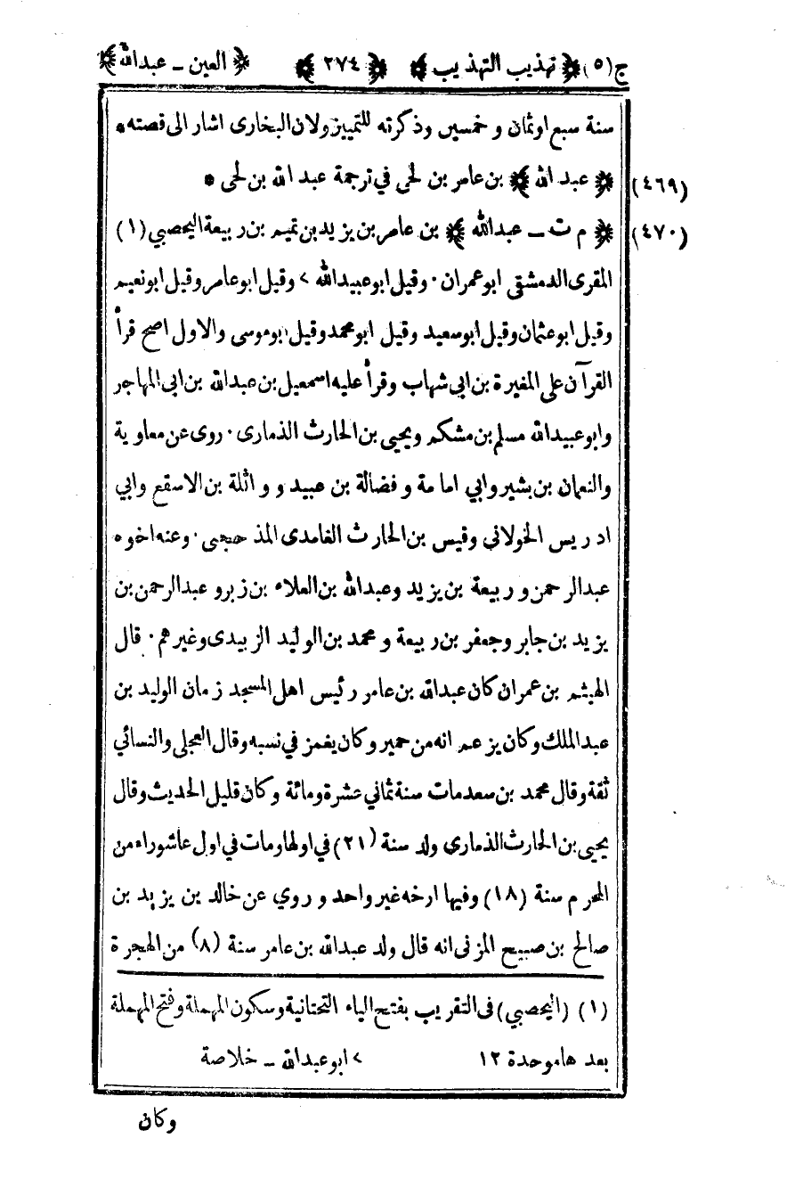 470 - "م ت - عبد الله" بن عامر بن يزيد بن تميم بن ربيعة اليحصبي1 المقري الدمشقي أبو عمران وقيل أبو عبيد الله وقيل أبو عامر وقيل أبو نعيم وقيل أبو عثمان وقيل أبو سعيد وقيل أبو محمد وقيل أبو موسى والأول أصح قرأ القرآن على المغيرة بن أبي شهاب وقرأ عليه إسماعيل بن عبد الله بن أبي المهاجر وأبو عبيد الله مسلم بن مشكم ويحيى بن الحارث الذماري روى عن معاوية والنعمان بن بشير وأبو أمامة وفضالة بن عبيد وواثلة بن الأسقع وأبي إدريس الخولاني وقيس بن الحارث الغامدي المذحجي وعنه أخوه عبد الرحمن وربيعة بن يزيد وعبد الله بن العلاء بن زبر وعبد الرحمن بن يزيد بن جابر وجعفر بن ربيعة ومحمد بن الوليد الزبيدي وغيرهم قال الهيثم بن عمران كان عبد الله بن عامر رئيس أهل المسجد زمان الوليد بن عبد الملك وكان يزعم أنه من حمير وكان يغمز في نسبه وقال العجلي والنسائي ثقة وقال محمد بن سعد مات سنة ثماني عشرة ومائة وكان قليل الحديث وقال يحيى بن الحارث الذماري ولد سنة 21 في أولها ومات في أول عاشوراء من المحرم سنة 18 وفيها أرخه غير واحد وروي عن خالد بن يزيد بن صالح بن صبيح المزني أنه قال ولد عبد الله بن عامر سنة 8 من الهجرة