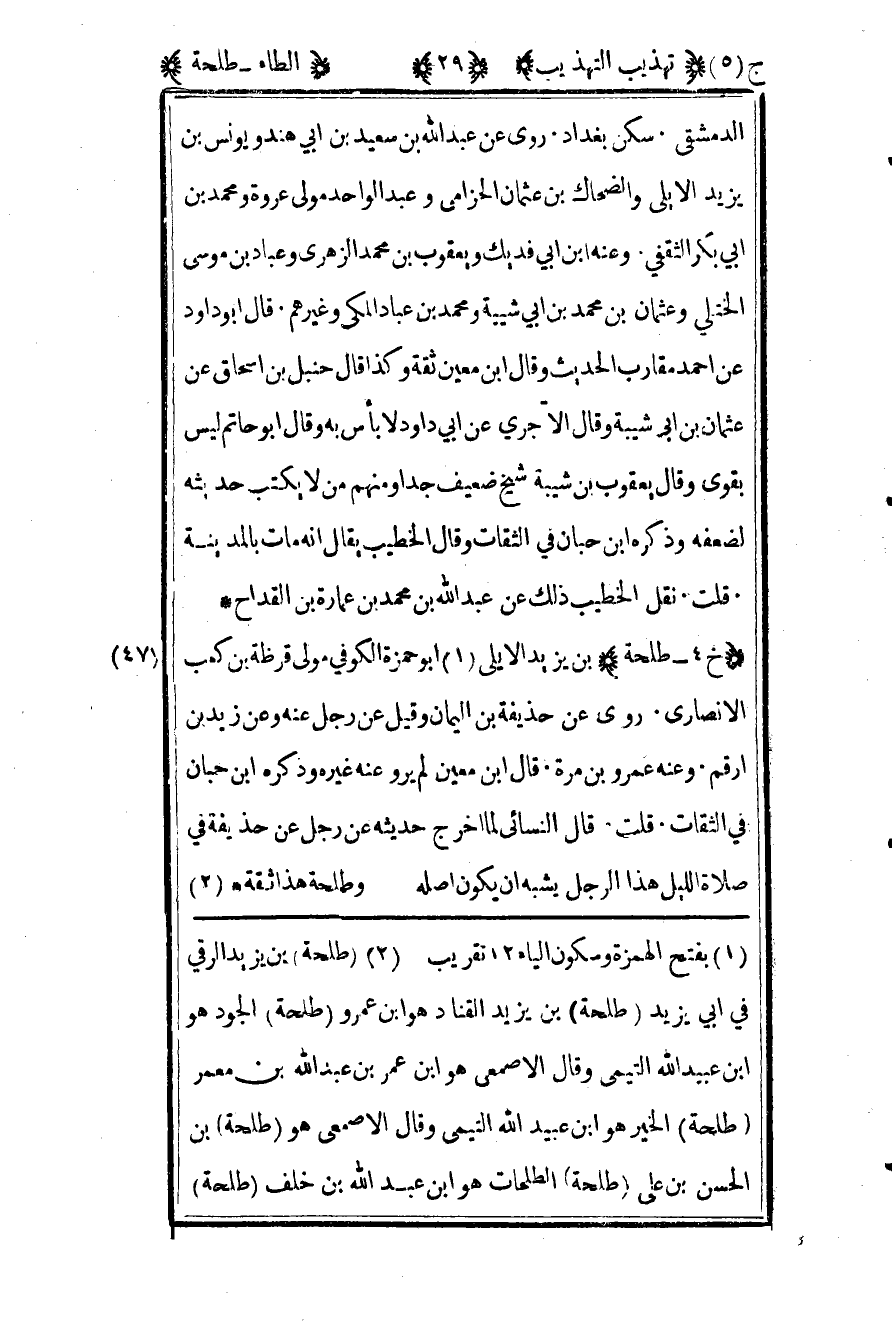 2"طلحة" بن يزيد الرقي في أبي يزيد الرقي في أبي يزيد "طلحة" بن يزيد القناد هو ابن عمرو "طلحة" الجود هو ابن عبيد الله التيمي وقال الأصمعي وقال الأصمعي هو ابن عمر بن عبد الله بن معمر "طلحة" الطلحات هو ابن عبد الله بن خلف "طلحة" الفياض هو ابن عبيد الله التيمي "طلحة" القناد هو ابن عمرو "طلحة" الندى هو ابن عبد الله بن عوف "طلحة" مولى سعد في سعد مولى طلحة "طلحة" عن ثوبان هو ابن عمرو بن عثمان الحضرمي هو ابن عمرو بن عثمان 12 كلها عن هامش الأصل.