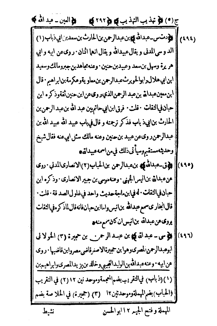 496 - "سي - عبد الله" بن عبد الرحمن بن حجيرة3 الخولاني أبو عبد الرحمن المصري وهو ابن حجيرة الأصغر قاضي مصر وابن قاضيها روى عن أبيه وعنه عبد الله بن الوليد التجيبي وخالد بن يزيد المصري وإبراهيم بن