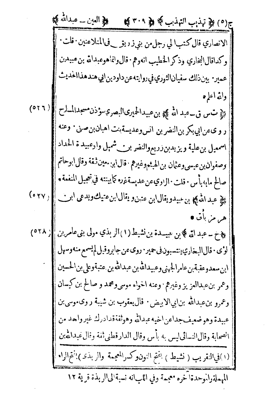 526 - "ت س ق - عبد الله" بن عبيد الحميري البصري مؤذن مسجد المسارح روى عن أبي بكر بن النضر بن أنس وعديسة بنت أهبان بن صيفي وعنه إسماعيل بن علية ويزيد بن زريع والنضر بن شميل وأبو عبيد الحداد وصفوان بن عيسى وعثمان بن الهيثم وغيرهم قال ابن معين ثقة وقال أبو حاتم صالح ما به بأس قلت الراوي عن عديسة غيره كما بينته في تعجيل المنفعة.