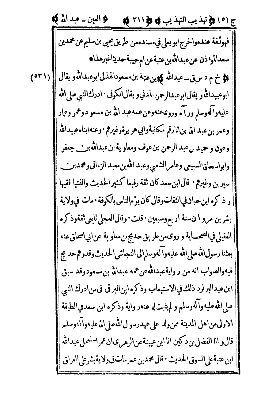 531 - "خ م د س ق - عبد الله" بن عتبة بن مسعود الهذلي أبو عبد الله ويقال أبو عبيد الله ويقال أبو عبد الرحمن المدني ويقال الكوفي أدرك النبي صلى الله عليه وسلم ورآه وروى عنه وعن عمه عبد الله بن مسعود وعمر وعمار وعمر بن عبد الله بن الأرقم مكاتبة وأبي هريرة وغيرهم وعنه أبناه عبيد الله وعون وحميد بن عبد الرحمن بن عوف ومعاوية بن عبد الله بن جعفر وأبو إسحاق السبيعي وعامر الشعبي وعبد الله بن معبد الزماني ومحمد بن سيرين وغيرهم قال ابن سعد كان ثقة رفيعا كثير الحديث والفتيا فقيها وذكره ابن حبان في الثقات وقال يؤم الناس بالكوفة مات في ولاية بشر بن مروان سنة أربع وسبعين قلت وقال العجلي تابعي ثقة وذكره العقيلي في الصحابة وروى من طريق حديج بن معاوية عن أبي إسحاق عنه بعثنا رسول الله صلى الله عليه وسلم إلى النجاشي الحديث وقد وهم حديج فيه والصواب أنه من رواية عبد الله عن عمه عبد الله بن مسعود وقد سبق بن عبد البر لرد ذلك في الاستيعاب وذكره ابن البرقي فيمن أدرك النبي صلى الله عليه وسلم ولم يثبت له عنه رواية وذكره ابن سعد في الطبقة الأولى من أهل المدينة ممن ولد على عهد رسول الله صلى الله عليه وسلم قال وأنا الفضل بن دكين أنا بن عيينة عن الزهري أن عمر استعمل عبد الله بن عتبة على السوق الحديث قال محمد بن عمر مات في ولاية بشر على العراق