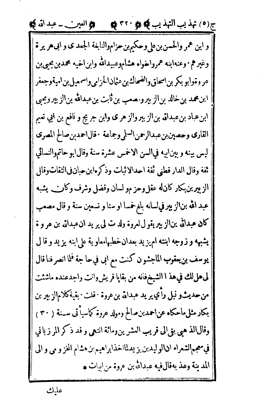 وابن عمر والحسن بن علي وحكيم بن حزام والنابغة الجعدي وأبي هريرة وغيرهم وعنه ابنه عمر وأخواه هشام وعبيد الله وابن أخيه محمد بن يحيى بن عروة وأبو بكر بن إسحاق والضحاك بن عثمان الحزامي وإسماعيل بن أمية وجعفر بن محمد بن خالد بن الزبير ومصعب بن ثابت بن عبد الله بن الزبير ويحيى بن عباد بن عبد الله بن الزبير والزهري وابن جريج ونافع بن أبي نعيم القاري وحصين بن عبد الرحمن السلمي وجماعة قال أحمد بن صالح المصري ليس بينه وبين أبيه في السن إلا خمس عشرة سنة وقال أبو حاتم والنسائي ثقة وقال الدارقطني ثقة أحد الاثبات وذكره ابن حبان في الثقات الزبير بن بكار كان له عقل وحزم ولسان وفضل وشرف وكان يشبه عبد الله بن الزبير في لسانه بلغ خمسا أو ستا وتسعين سنة وقال مصعب كان عبد الله بن الزبير يقول لعروة ولدت لي يريد أن عبد الله بن عروة يشبهه وزوجه ابنته أم يزيد بعد أن خطبها معاوية على ابنه يزيد وقال يوسف بن يعقوب الماجشون كنت مع أبي في حاجة فلما انصرفنا قال لي هل لك في هذا الشيخ فإنه من بقايا قريش وأنت وأجد عنده ما شئت من حديث ونبل رأي يريد عبد الله بن عروة قلت بقية كلام الزبير بن بكار مثل ما حكاه عن أحمد بن صالح ومولد عروة كما سيأتي سنة 30 وقال الذهبي بقي إلى قريب العشرين ومائة انتهى وقد ذكر المرزباني في معجم الشعراء أن الوليد بن يزيد لما أخذ إبراهيم بن هشام المخزومي وإلي المدينة وعذبه قال فيه عبد الله بن عروة من أبيات