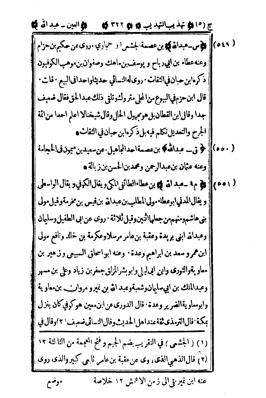 549 - "س - عبد الله" بن عصمة الجشمي1 حجازي روى عن حكيم بن حزام وعنه عطاء بن أبي رباح ويوسف بن ماهك وصفوان بن موهب الكوفيون ذكره ابن حبان في الثقات. روى له النسائي حديثا واحدا في البيع قلت قال ابن حزم في البيوع من المحلي متروك وتلقى ذلك عبد الحق فقال ضعيف جدا وقال ابن القطان بل هو مجهول الحال وقال شيخنا لا أعلم أحدا من أئمة الجرح والتعديل تكلم فيه بل ذكره ابن حبان في الثقات.