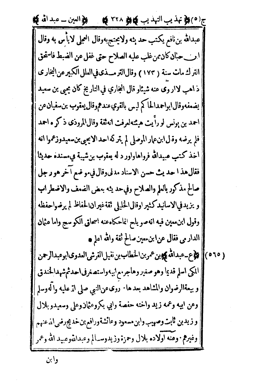 565 - "ع - عبد الله" بن عمر بن الخطاب بن نفيل القرشي العدوي أبو عبد الرحمن المكي أسلم قديما وهو صغير وهاجر مع أبيه واستصغر في أحد ثم شهد الخندق وبيعة الرضوان والمشاهد بعدها روى عن النبي صلى الله عليه وسلم وعن أبيه وعمه زيد وأخته حفصة وأبي بكر وعثمان وعلي وسعيد وبلال وزيد بن ثابت وصهيب وابن مسعود وعائشة ورافع بن خديج رضى الله تعالى عنهم وغيرهم وعنه أولاده بلال وحمزة وزيد وسالم وعبد الله وعبيد الله وعمر