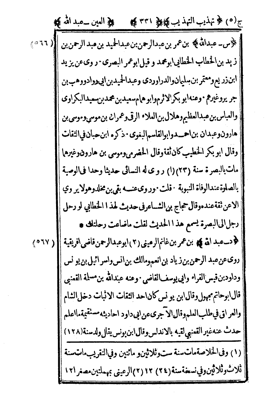 566 - "س - عبد الله" بن عمر بن عبد الرحمن بن عبد الحميد بن عبد الرحمن بن زيد بن الخطاب الخطابي أبو محمد وقيل أبو عمر البصري روى عن يزيد بن زريع ومعتمر بن سليمان والداروردي وعبد الحميد بن أبي رواد ووهب بن جرير وغيرهم وعنه أبو بكر الأثرم وأبو همام سعيد بن محمد بن سعيد البكراوي والعباس بن عبد العظيم وهلال بن العلاء الرقي وعمران بن موسى وموسى بن هارون وعبدان بن أحمد وأبو القاسم البغوي ذكره ابن حبان في الثقات وقال أبو بكر الخطيب كان ثقة وقال الحضرمي وموسى بن هارون وغيرهما مات بالبصرة سنة 23 (1) روى له النسائي حديثا واحدا في الوصية بالصلاة عند الوفاة النبوية قلت وروى عنه بقي بن مخلد وهو لا يروي إلا عن ثقة عنده وقال حجاج بن الشاعر في حديث لهذا الخطابي لو رحل رجل إلى البصرة يسمع هذا الحديث لقلت ما ضاعت رحلتك.