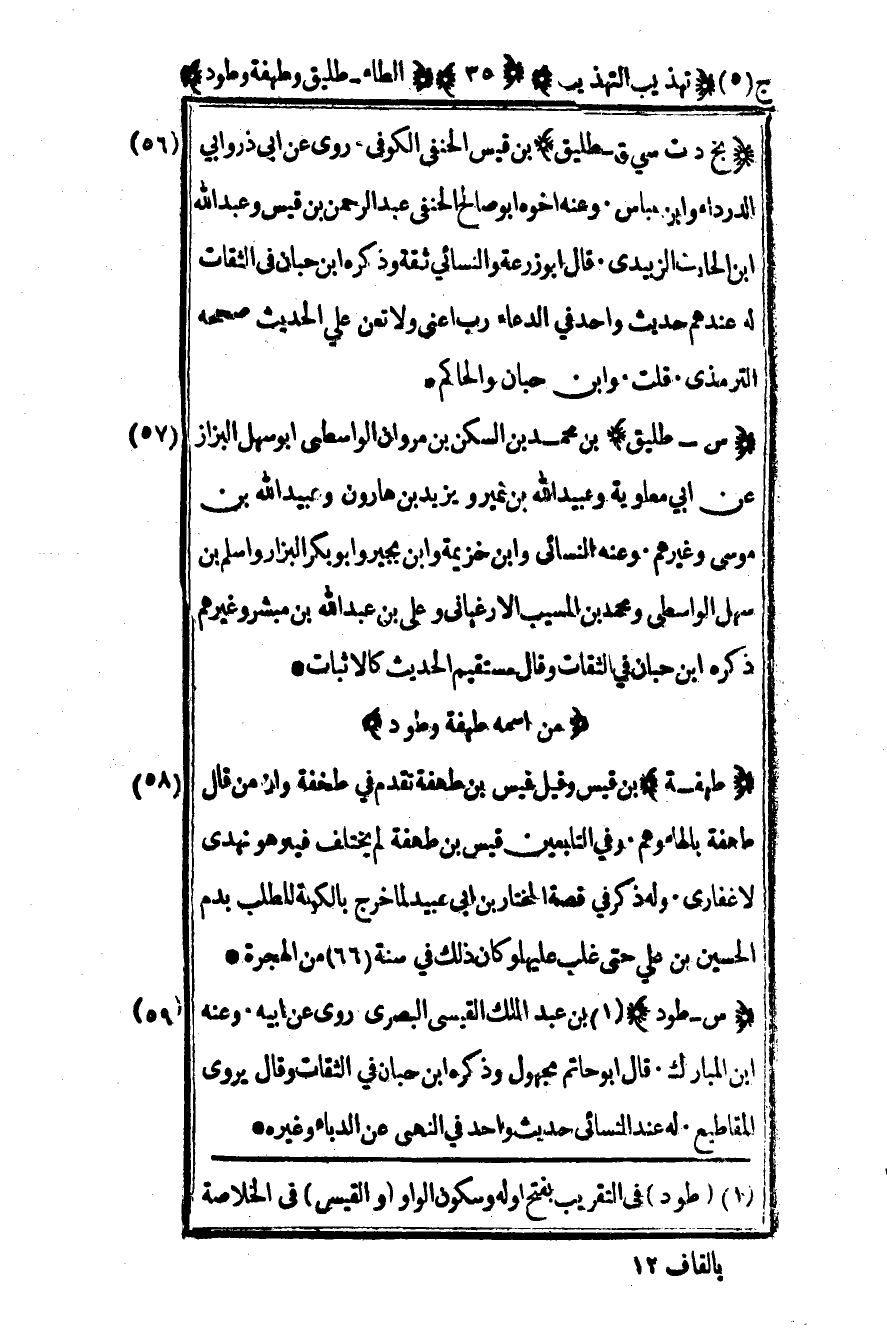 58 - "طهفة" بن قيس وقيل قيس بن طهفة تقدم في طخفة وإن من قال طهفة بالهاء وهم وفي التابعين قيس بن طهفة لم يختلف فيه وهو نهدي لا غفاري وله ذكر في قصة المختار بن أبي عبيد لما خرج بالكوفة للطلب بدم الحسين بن علي حتى غلب عليها وكان ذلك في سنة 66 من الهجرة