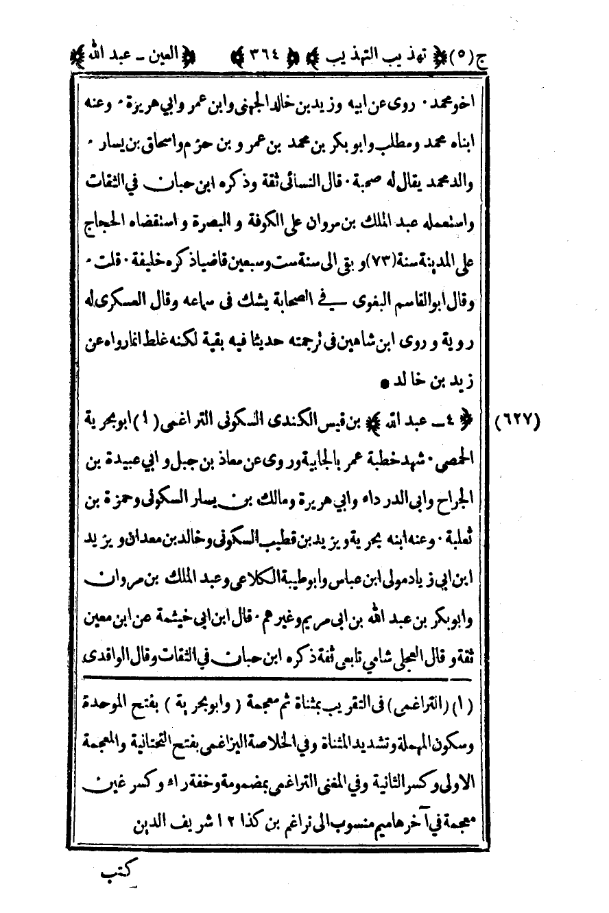 1 "التراغمي" في التقريب بمثناة ثم معجمة "وأبو بحرية" بفتح الموحدة وسكون المهملة وتشديد المثناة وفي الخلاصة اليزاغمي بفتح التحتانية والمعجمة الأولى وكسر الثانية وفي المغني التراغمي بمضمومة وخفة راء وكسر غين معجمة في آخرها ميم منسوب إلى تراغم بن كذا 12 شريف الدين.